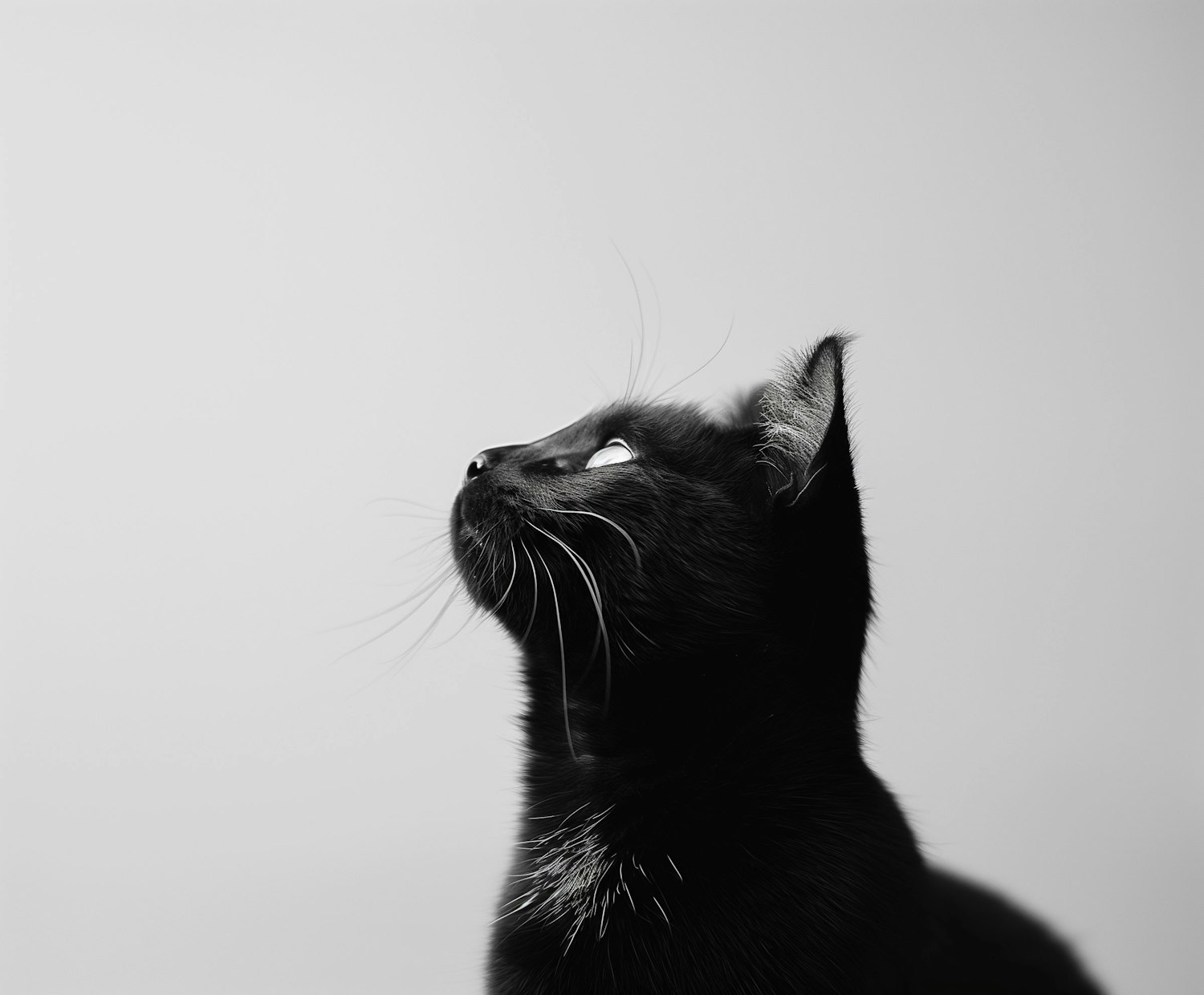 A sleek black cat with bright eyes looks upward against a soft gray background, highlighting its elegant profile and glossy fur.