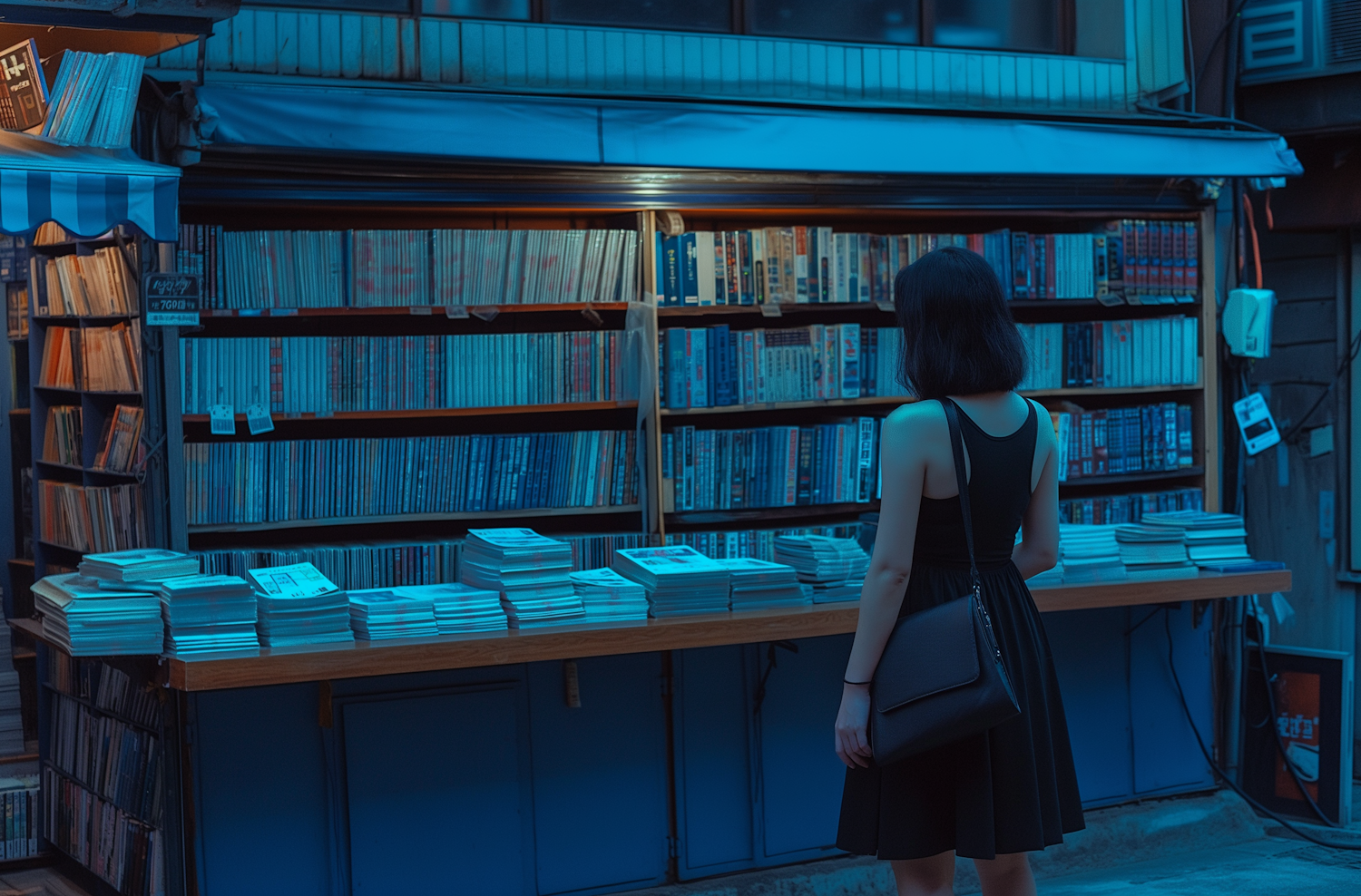 A woman in a black dress browses a bookstall at night, illuminated by a soft blue light, creating a serene and curious atmosphere.
