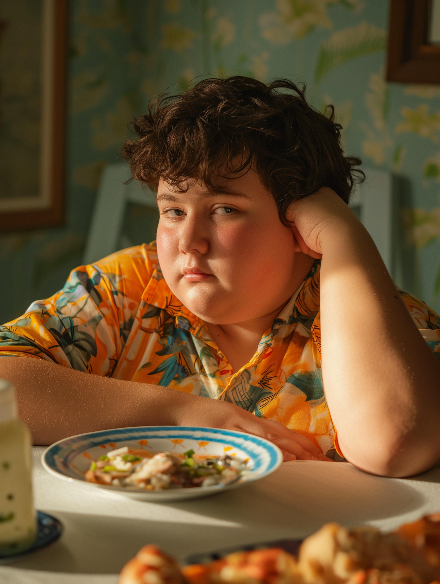 Young boy in a floral shirt sits at a table with a thoughtful expression, surrounded by warm, cozy lighting and floral wallpaper.