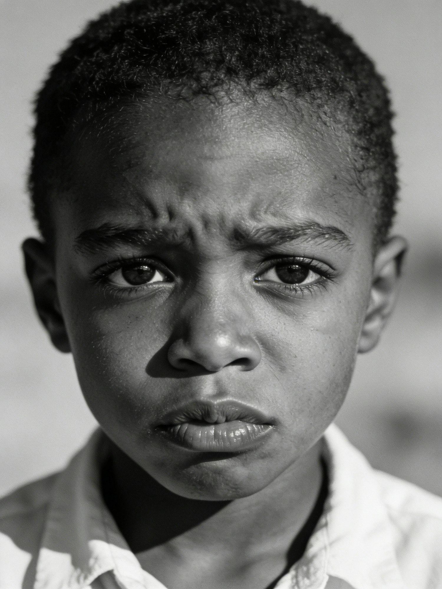 A young Black child with short hair wears a light-colored shirt and displays a deeply expressive pout—eyebrows furrowed, lips turned downward, eyes filled with emotion. The close-up black-and-white portrait captures a moment of vulnerability and intensity, evoking empathy and introspection. The background is neutral and softly blurred, allowing the child’s face and gesture to take full visual focus. Lighting is gentle and directional, highlighting skin texture, facial contours, and the emotional tension in the expression. The mood is tender and cinematic, blending childhood sensitivity with visual clarity. Hyperrealistic rendering should emphasize grayscale harmony, skin detail, and the subtle interplay of light and shadow across the face.