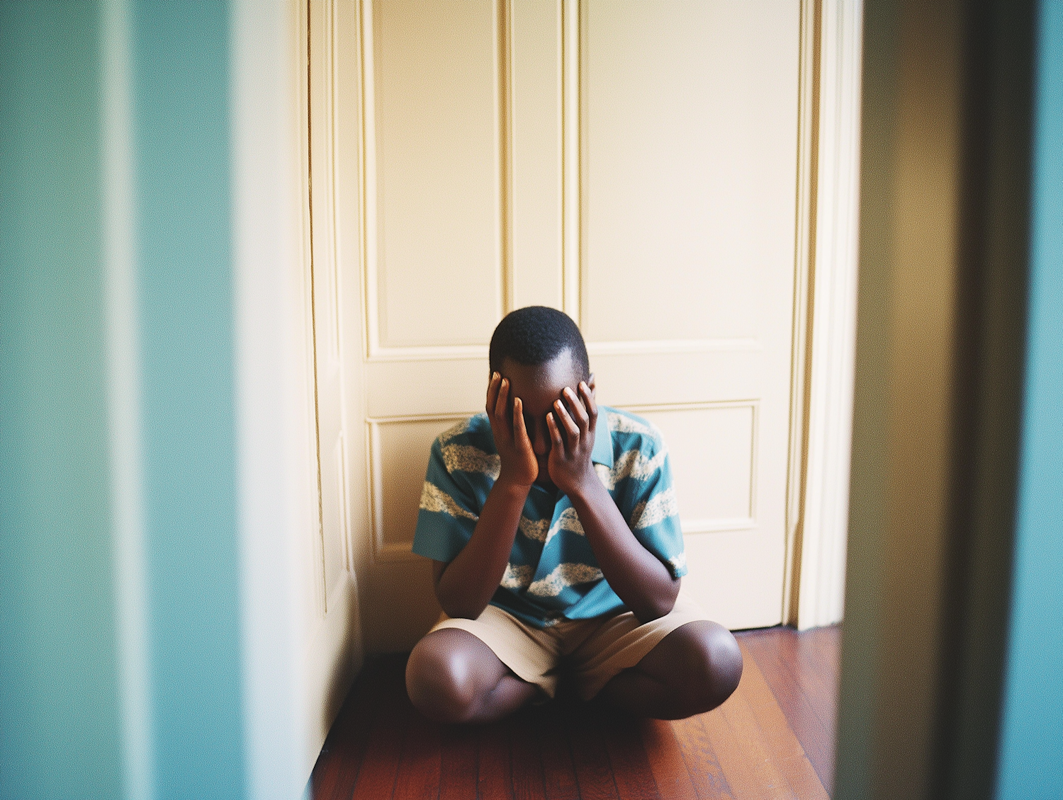 A young boy sits on the floor, covering his face with his hands, in a softly lit hallway, creating a contemplative mood.