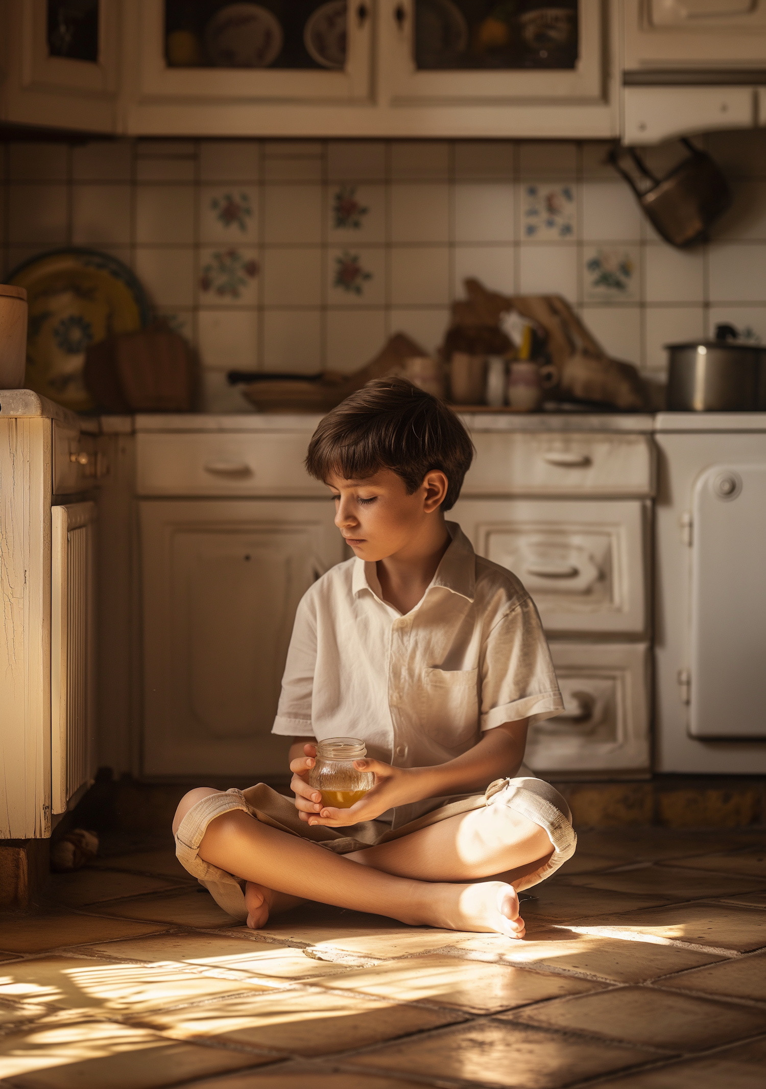 Young boy in a rustic kitchen, sitting on the floor with a jar of golden liquid, bathed in warm sunlight.