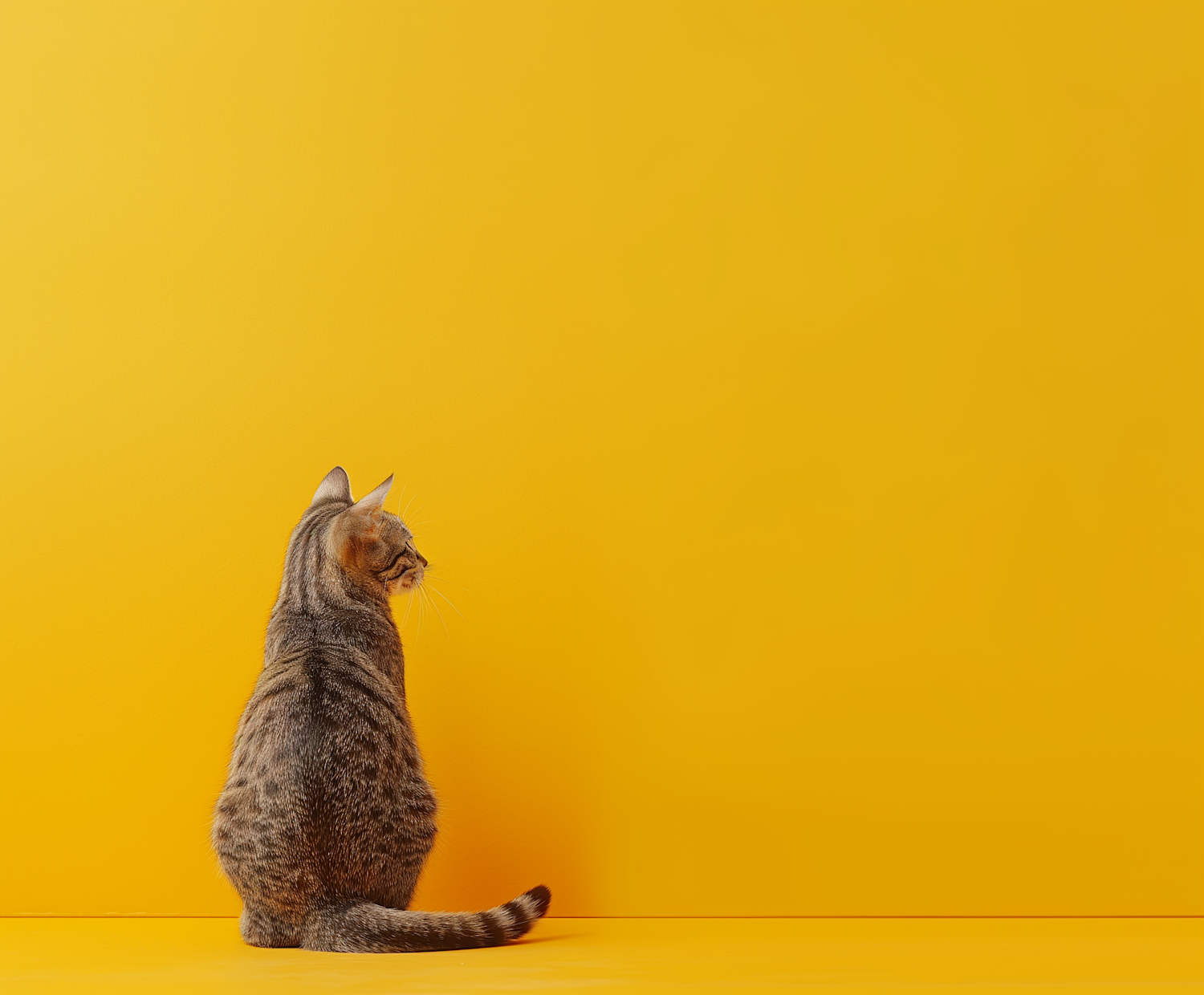 A tabby cat sits against a vibrant yellow background, creating a striking contrast with its muted fur tones.