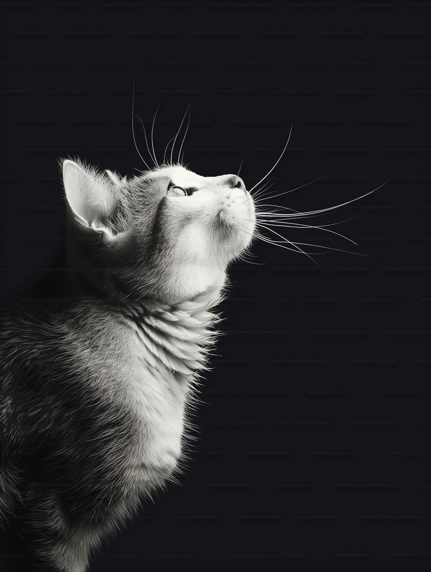 Elegant black and white photo of a cat gazing upwards, with detailed fur and prominent whiskers against a dark background.