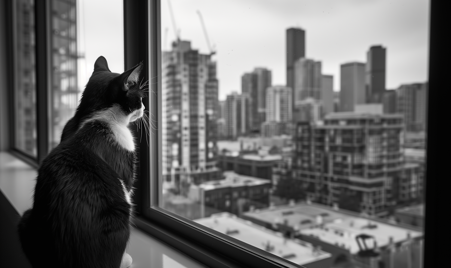 A black and white cat gazes out a window at a cityscape, creating a contemplative and moody atmosphere.