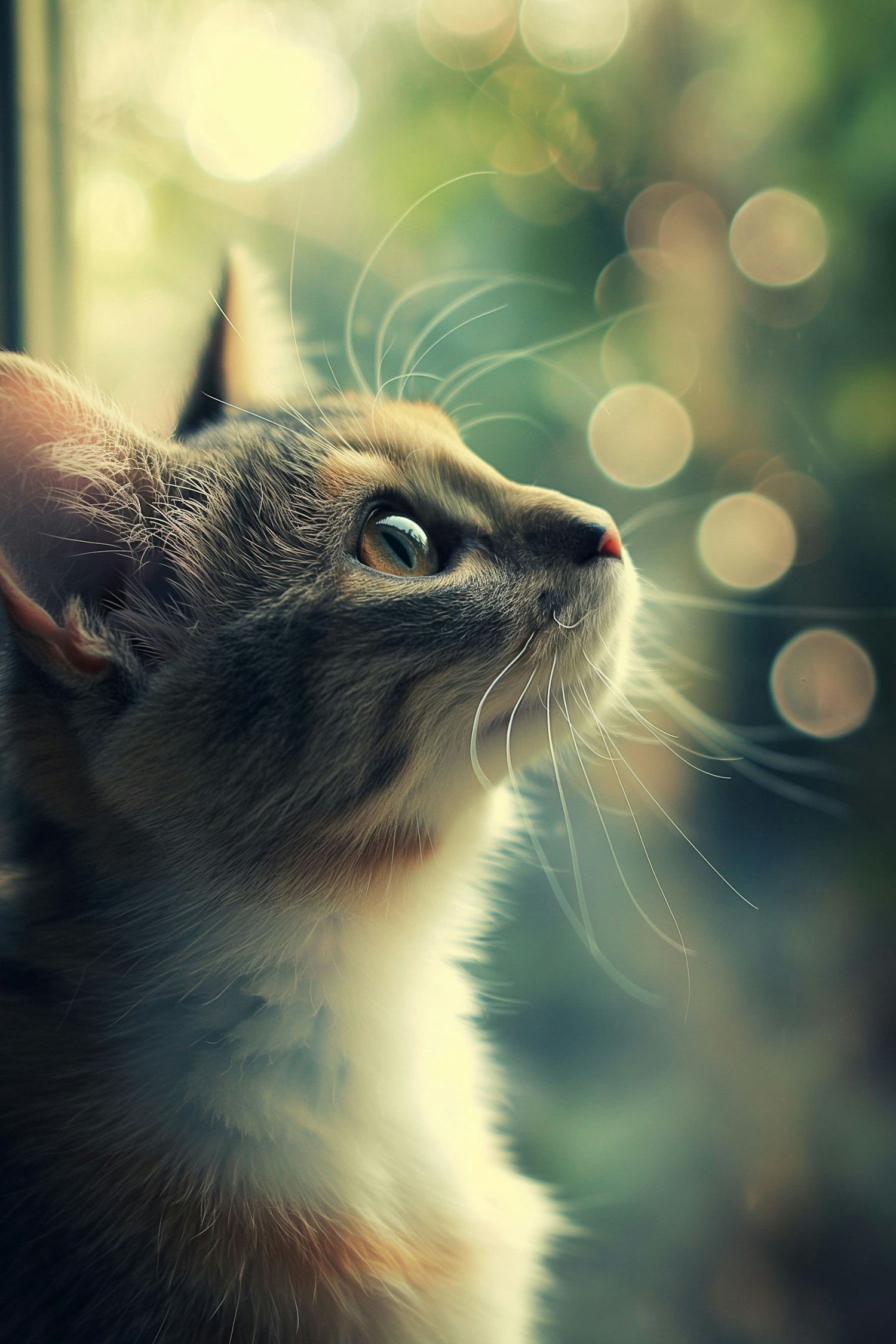 Close-up of a cat with amber eyes gazing out a window, surrounded by soft bokeh and warm lighting.