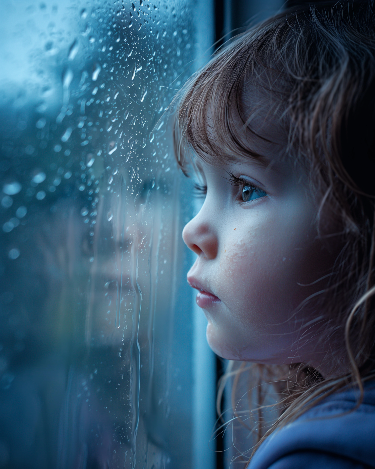 Child with brown hair and blue eyes gazes out a rain-speckled window, creating a serene and contemplative atmosphere.