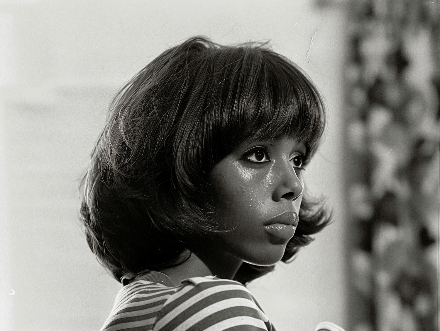 Black and white portrait of a young woman with a voluminous bob hairstyle and striped top, exuding elegance and introspection.