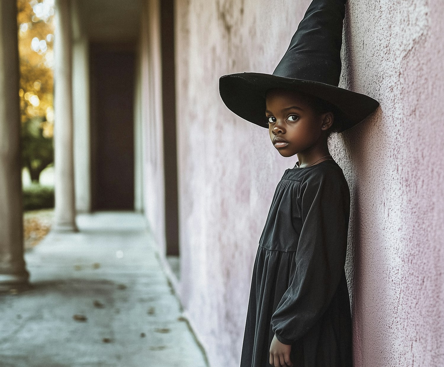 Young girl in a witch costume stands against a pink wall, wearing a black dress and hat, with autumn foliage in the background.