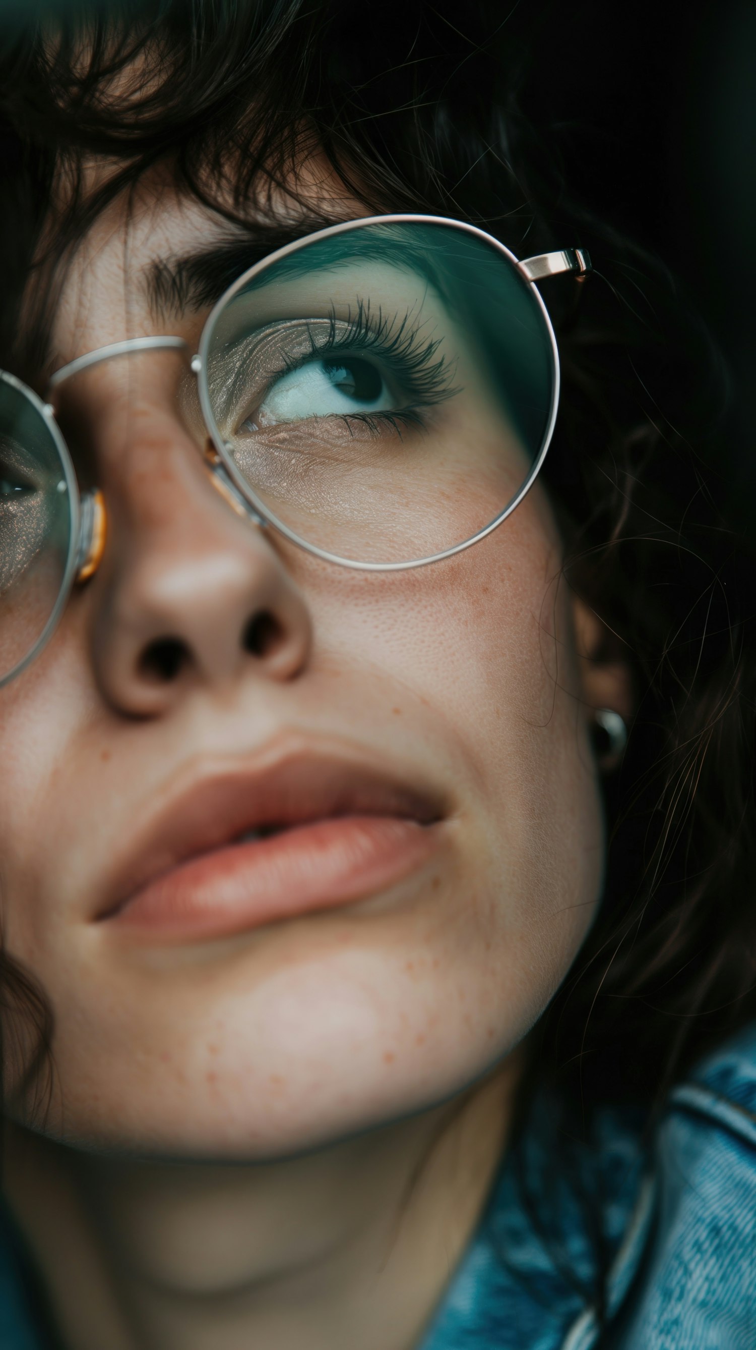 Close-up of a person with round glasses, looking upwards. Focus on eyes and facial details, creating an introspective mood.