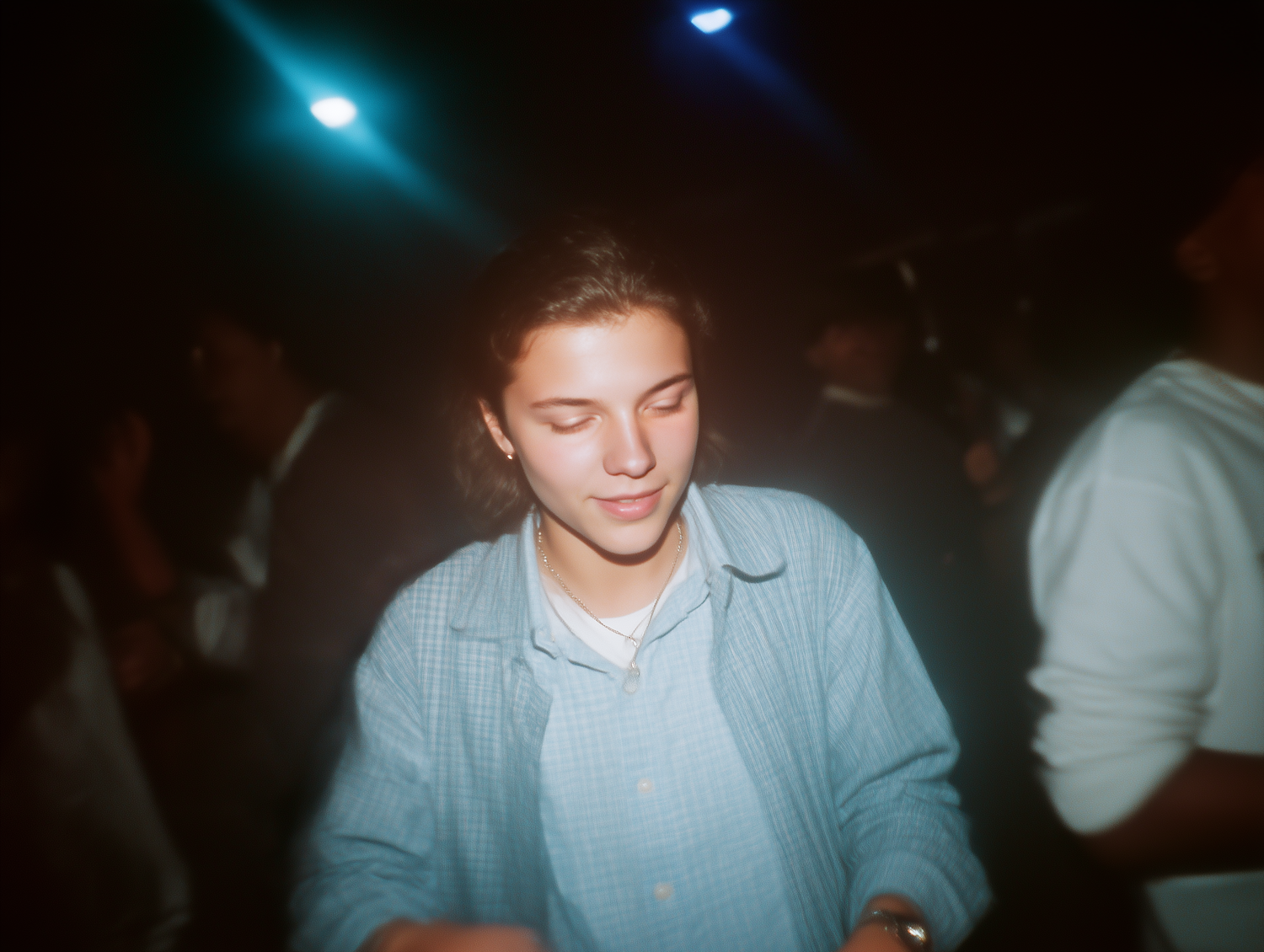 Young woman in a light blue shirt at a dimly lit party, eyes closed, surrounded by a blurred crowd and soft blue lighting.