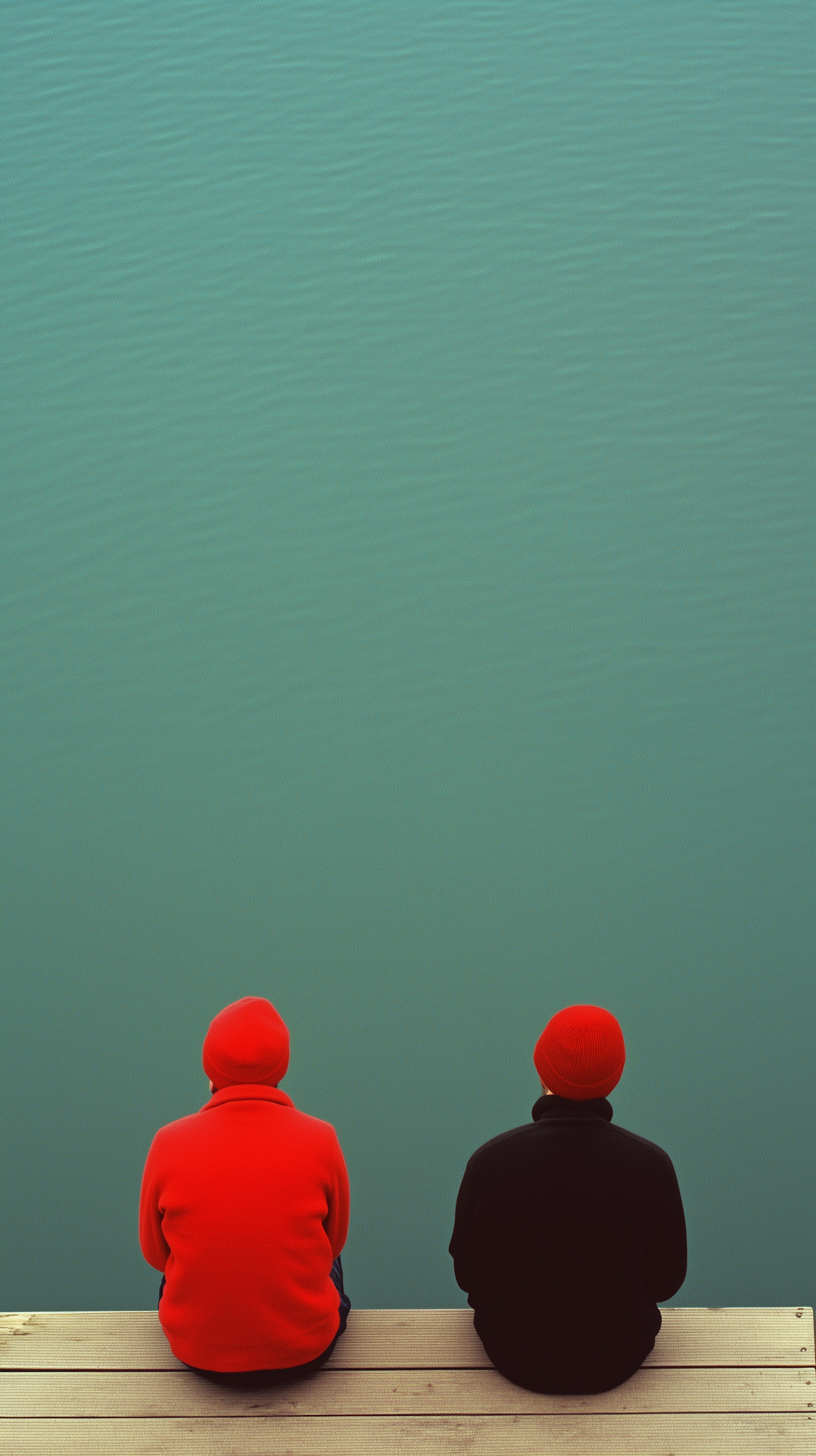 Two people in red and black jackets sit on a dock, facing calm teal water, creating a serene and contemplative scene.