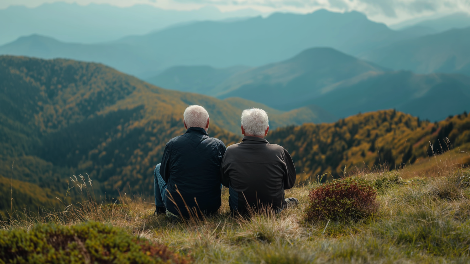 Two elderly men sit on a grassy hill, enjoying a panoramic view of rolling mountains under a cloudy sky.