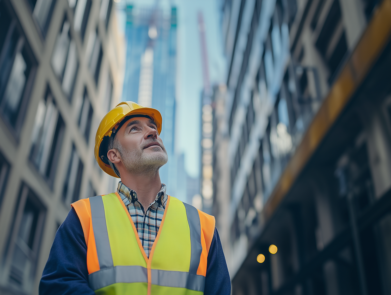 Construction worker in a hard hat and safety vest looks up at a city building site, surrounded by skyscrapers and cranes.