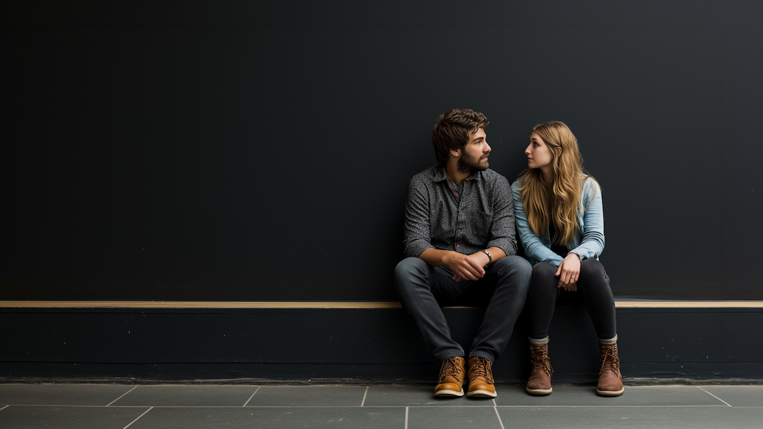 Young couple sitting on the floor against a dark wall, wearing casual outfits and brown boots, sharing a moment of connection.