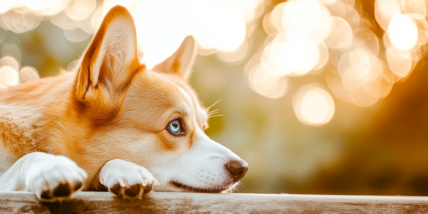 Adorable Corgi with blue eyes resting on a wooden surface, set against a warm, golden bokeh background.
