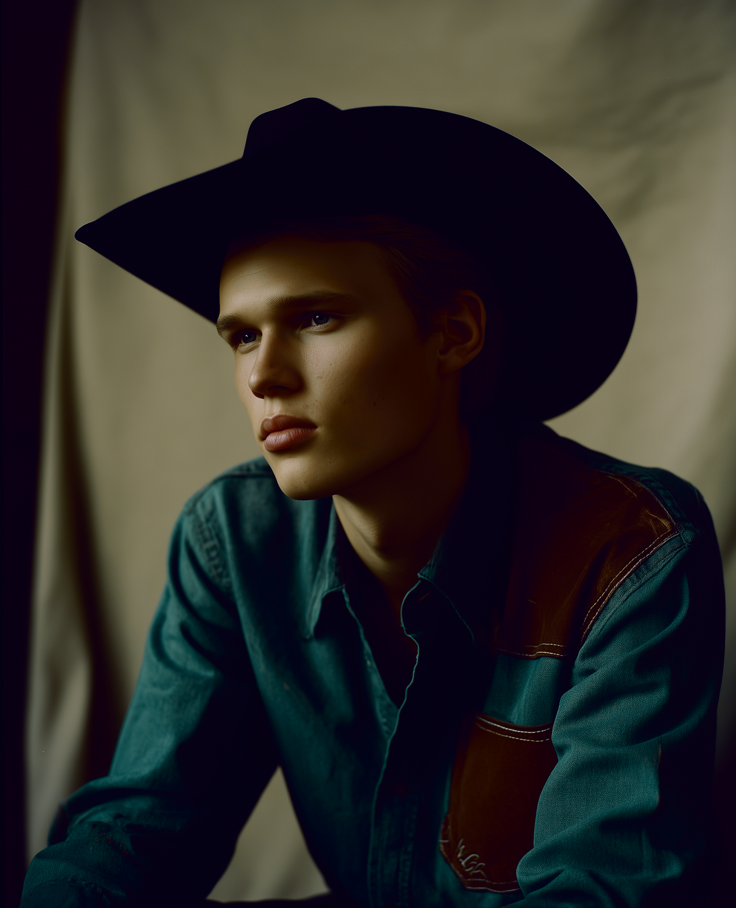 A contemplative portrait of a person in a cowboy hat and denim shirt, set against a neutral background with soft, dramatic lighting.