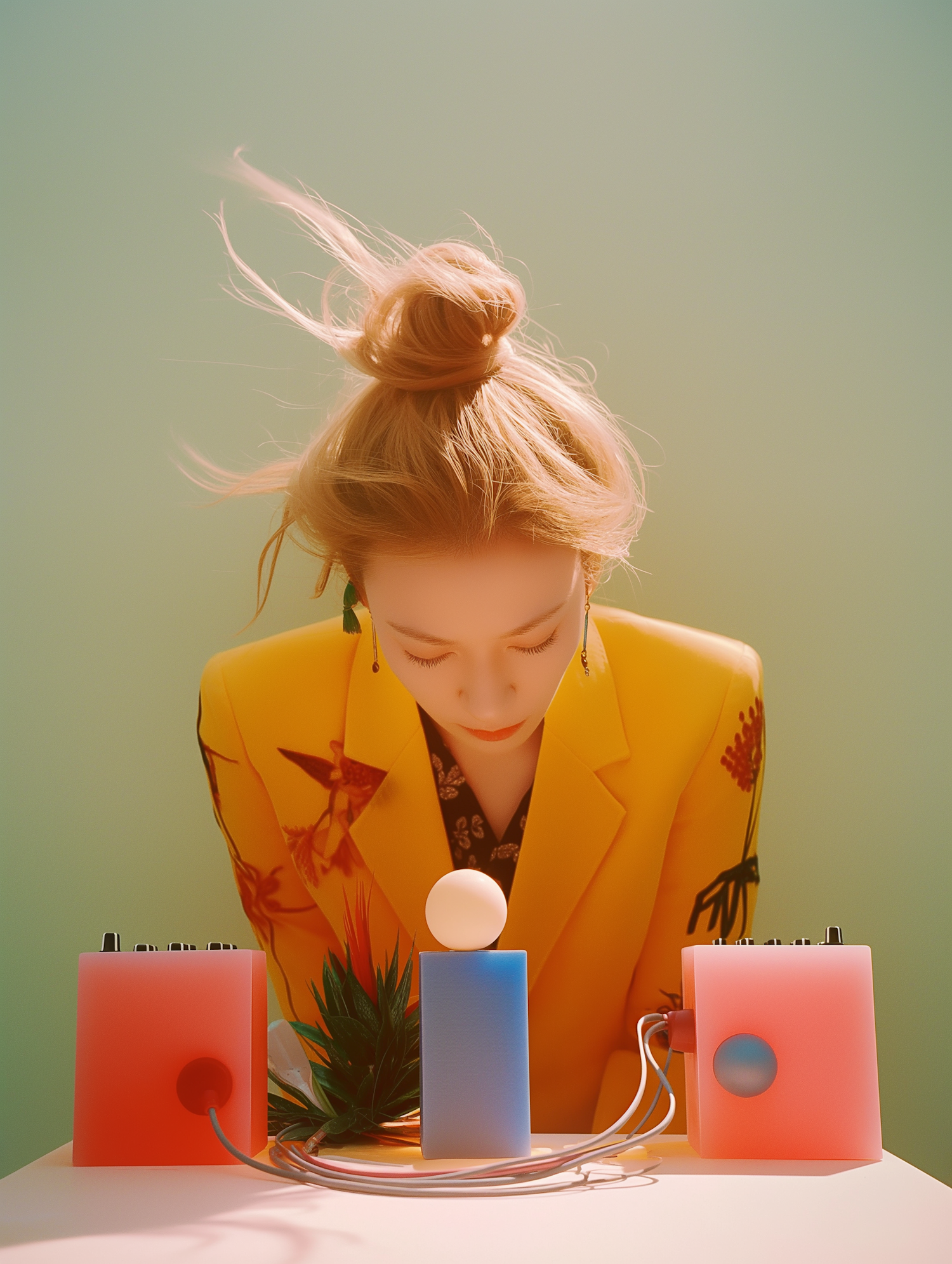 A woman in a yellow blazer leans over colorful electronic devices on a table, set against a soft green background.