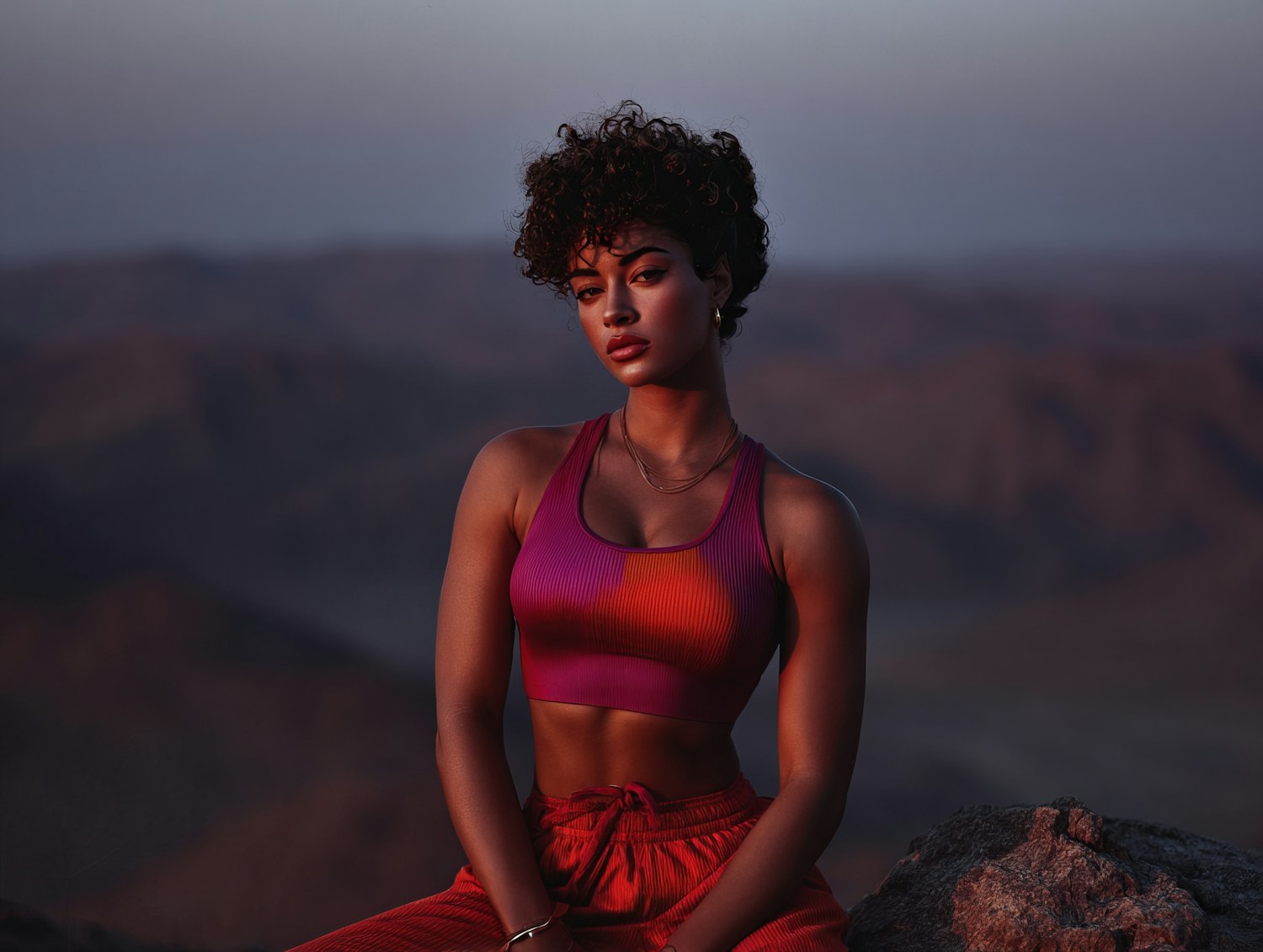 A woman in vibrant athletic wear sits on a rock with a serene desert landscape in the background, captured during a dusky evening.