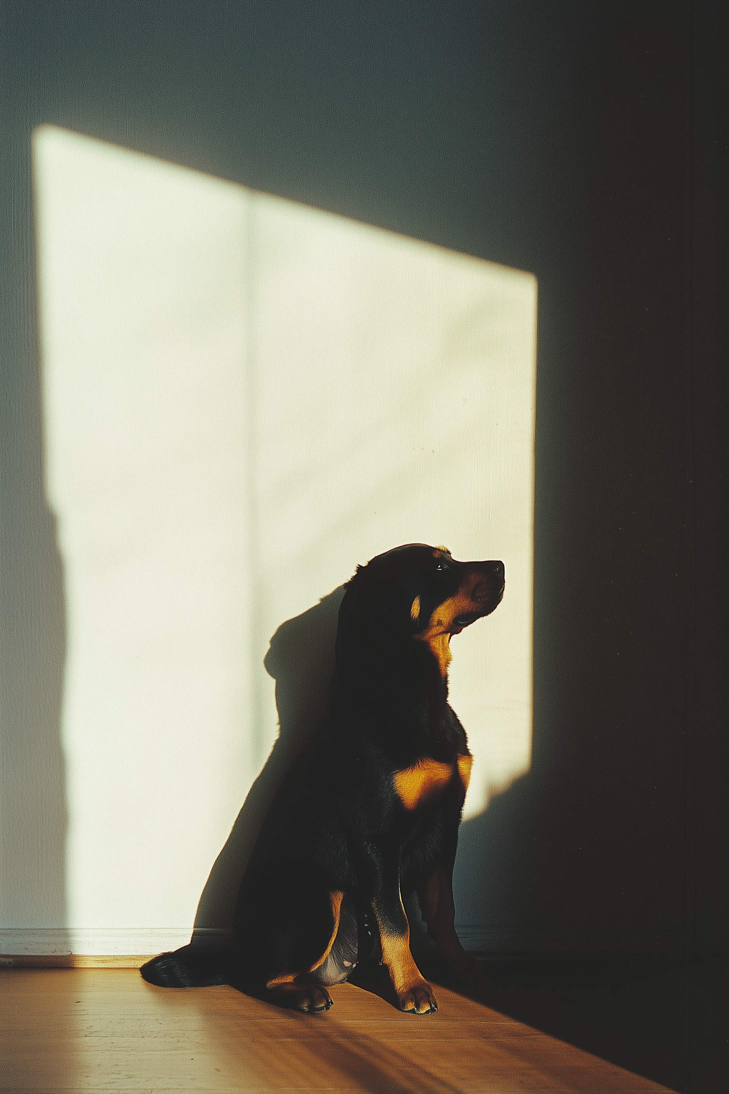 A black and tan dog sits in warm sunlight, casting a shadow on the wall. The serene scene highlights the play of light and shadow.