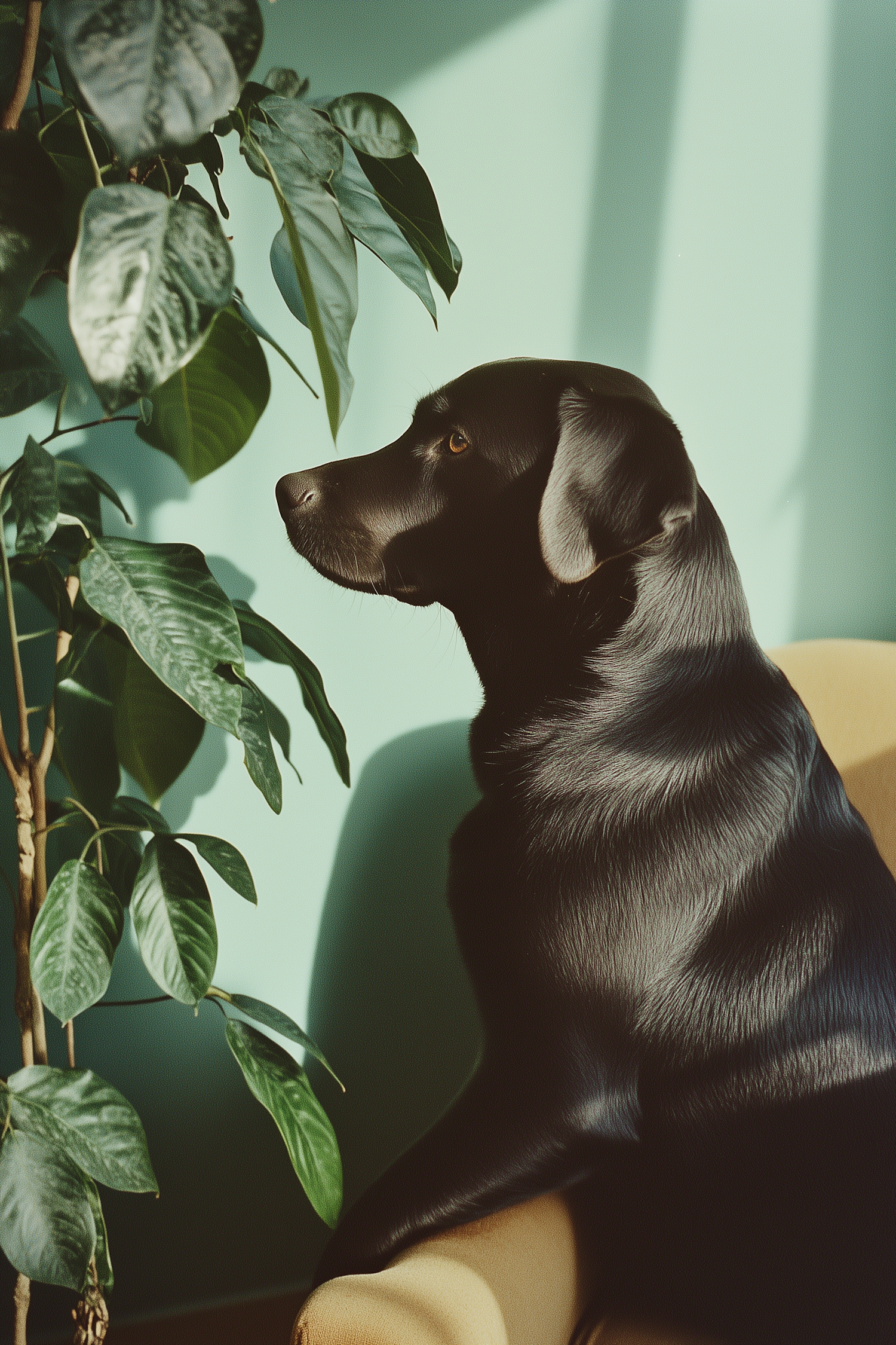 Black Labrador Retriever sits on a chair, gazing at a green plant against a mint green wall, creating a serene and harmonious scene.