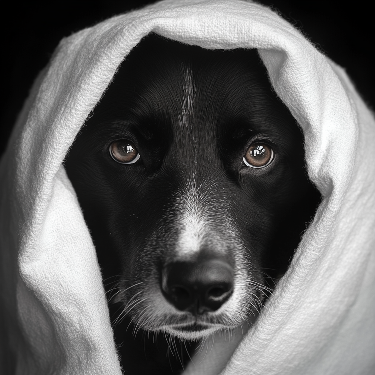 A black and white dog wrapped in a white towel, with expressive brown eyes and a calm gaze, set against a dark background.