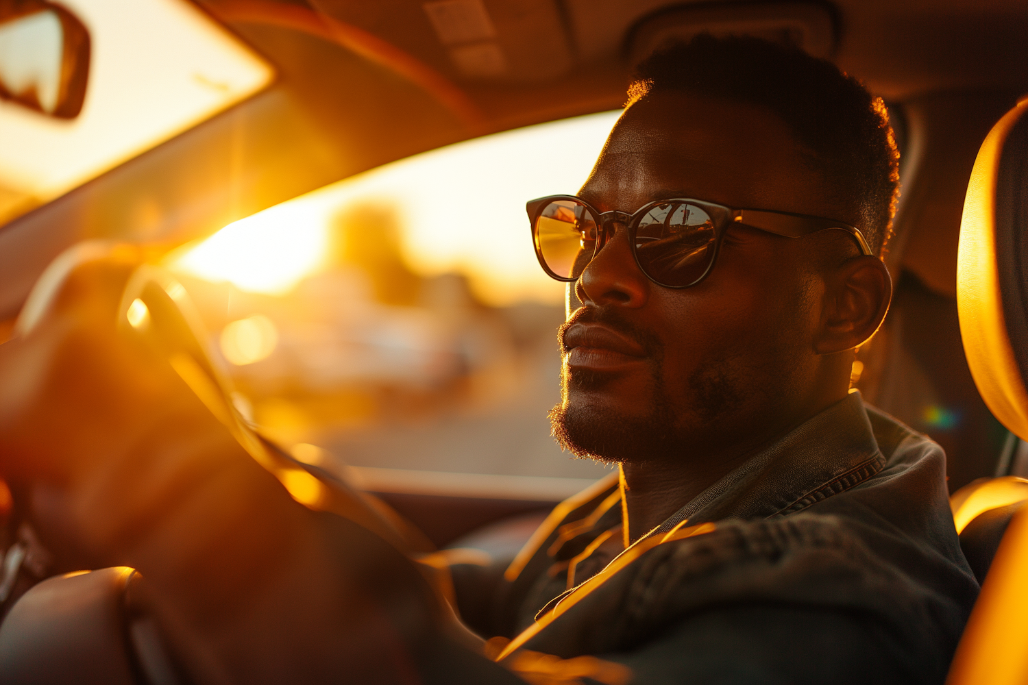 Man driving at sunset, wearing sunglasses, with warm golden light illuminating his face, creating a serene atmosphere.