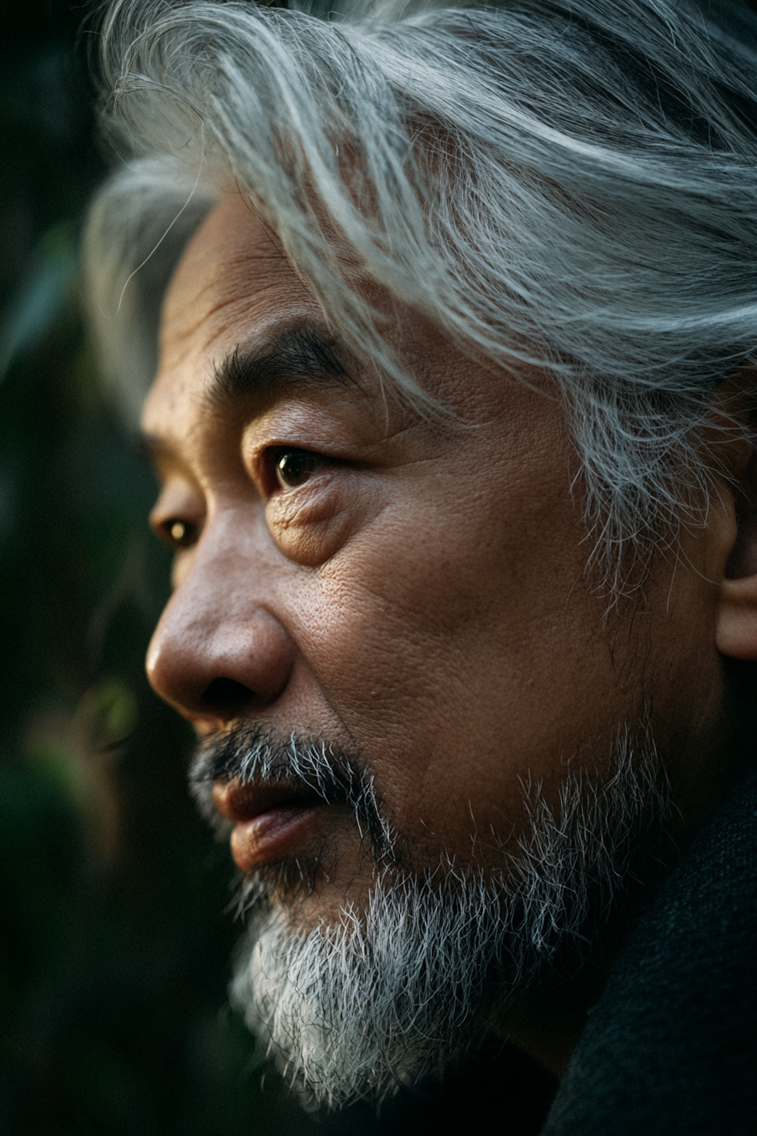 Close-up of an older man with silver hair and beard, captured in soft natural light with a blurred green background.