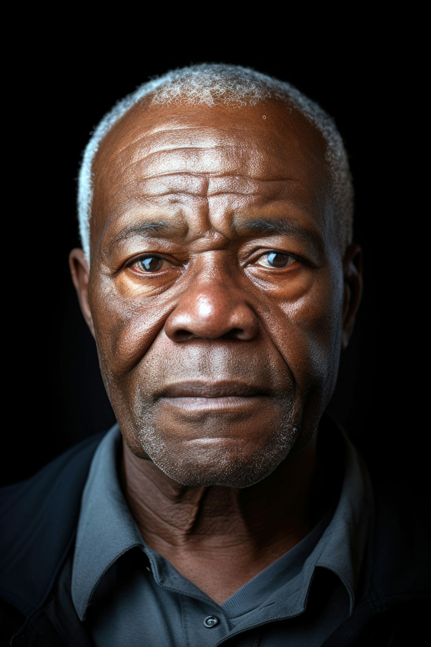 Portrait of an elderly Black man with gray hair and deep expression, wearing a dark shirt against a shadowy background.