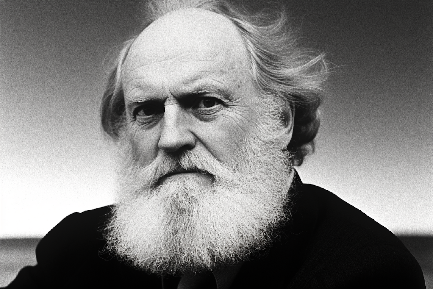 Black and white portrait of an elderly man with a white beard, serious expression, and windswept hair against a gradient background.