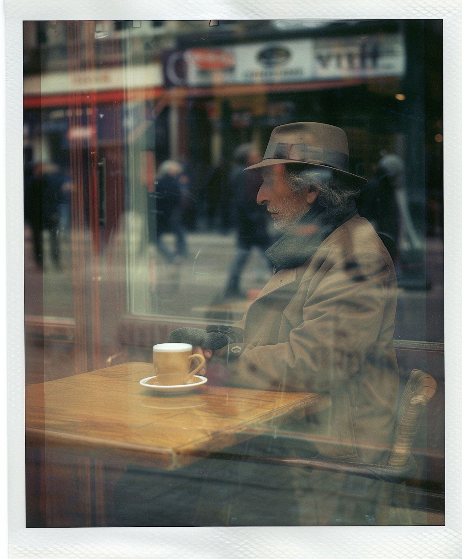 Elderly man in a cafe, wearing a trench coat and fedora, gazes out the window with a coffee. Urban street scene in the background.