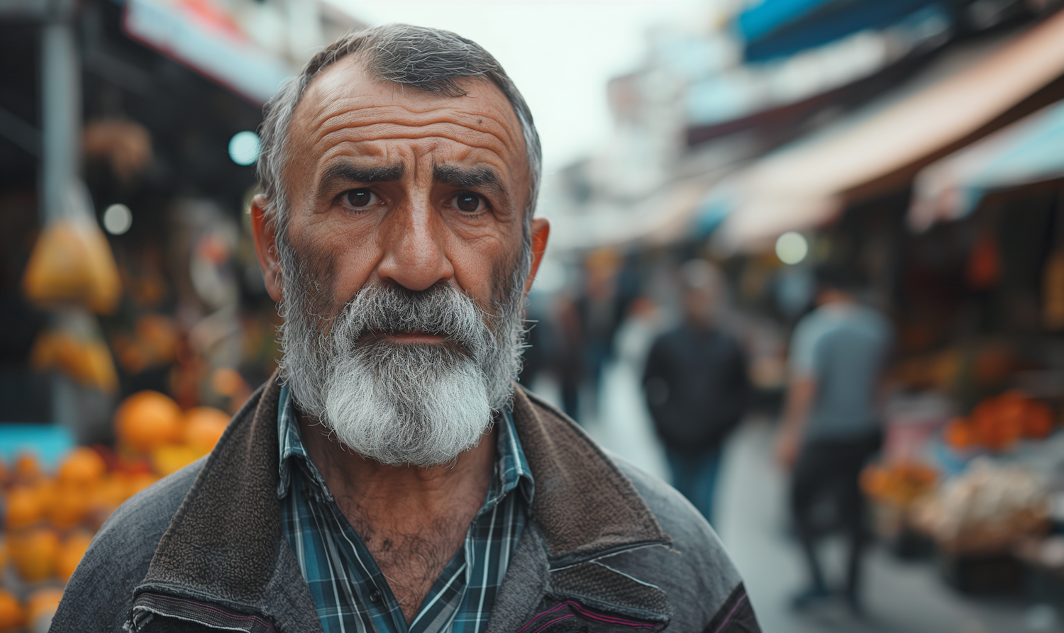 Elderly man with white beard in a vibrant market, wearing a plaid shirt and brown jacket, surrounded by colorful stalls and people.