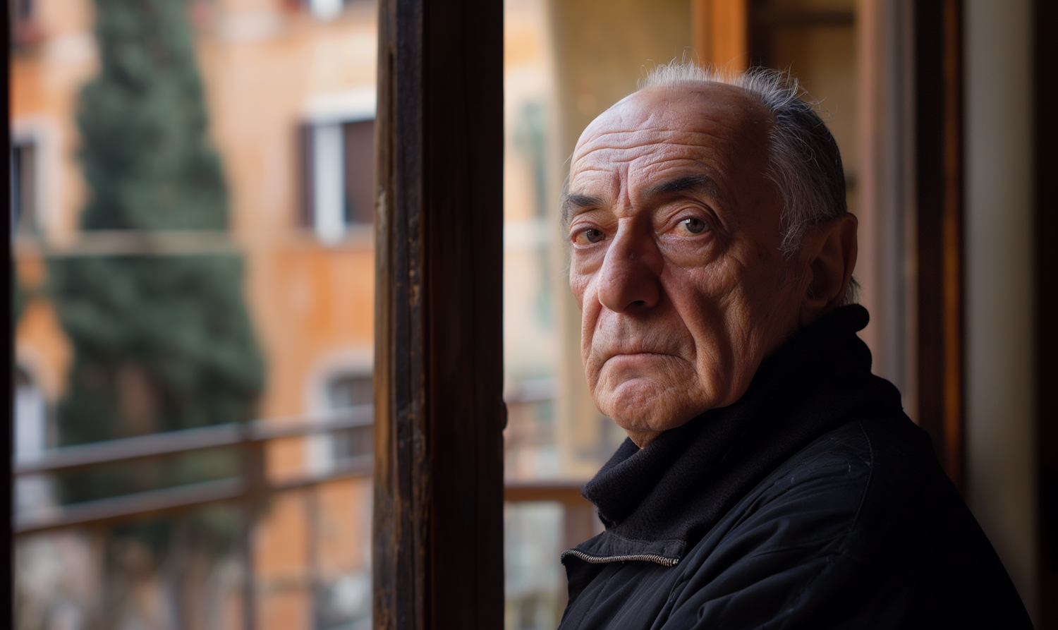 Elderly man with solemn expression by a window, wearing a black jacket. Soft urban background with warm tones and blurred details.