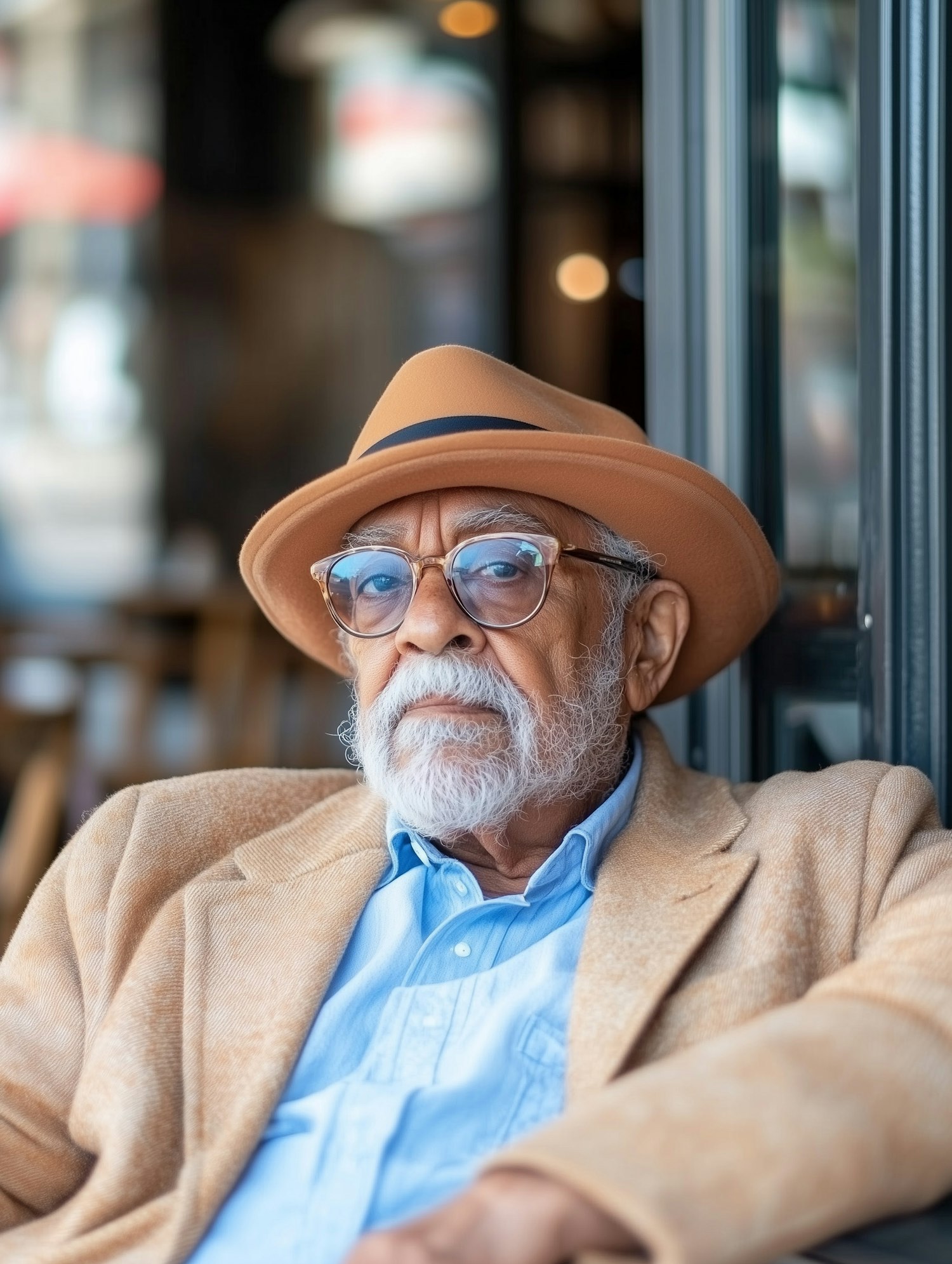 Elderly man with a white beard and glasses, wearing a tan blazer and fedora, sitting thoughtfully in a relaxed outdoor setting.
