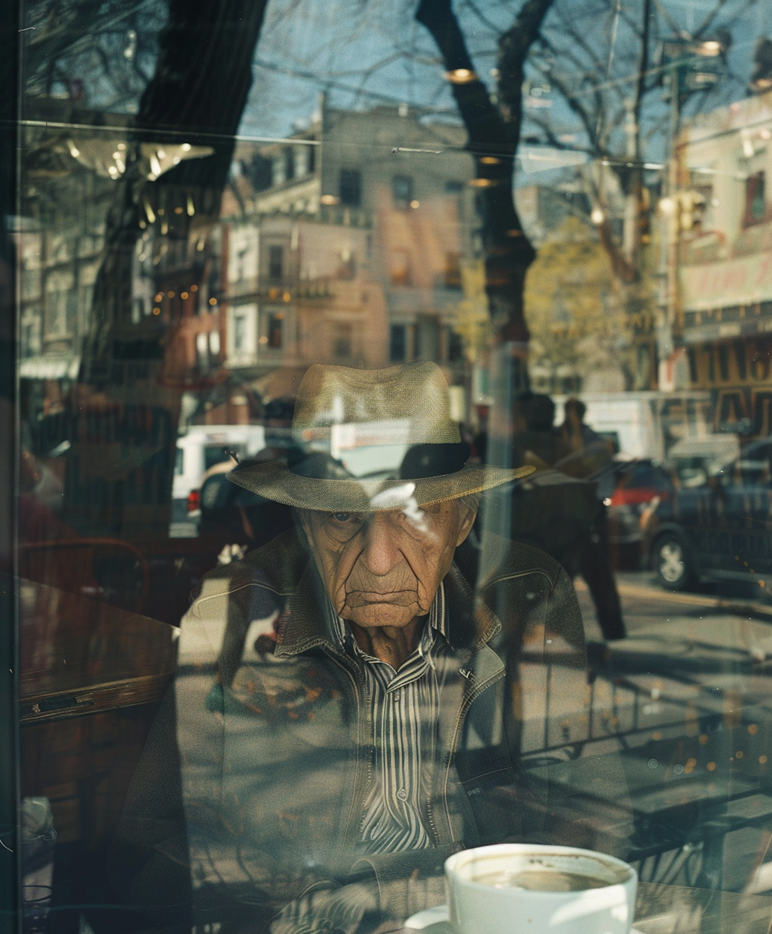 Elderly man in a cafe, wearing a fedora, gazes out the window with a contemplative expression. Reflections of a bustling street outside.