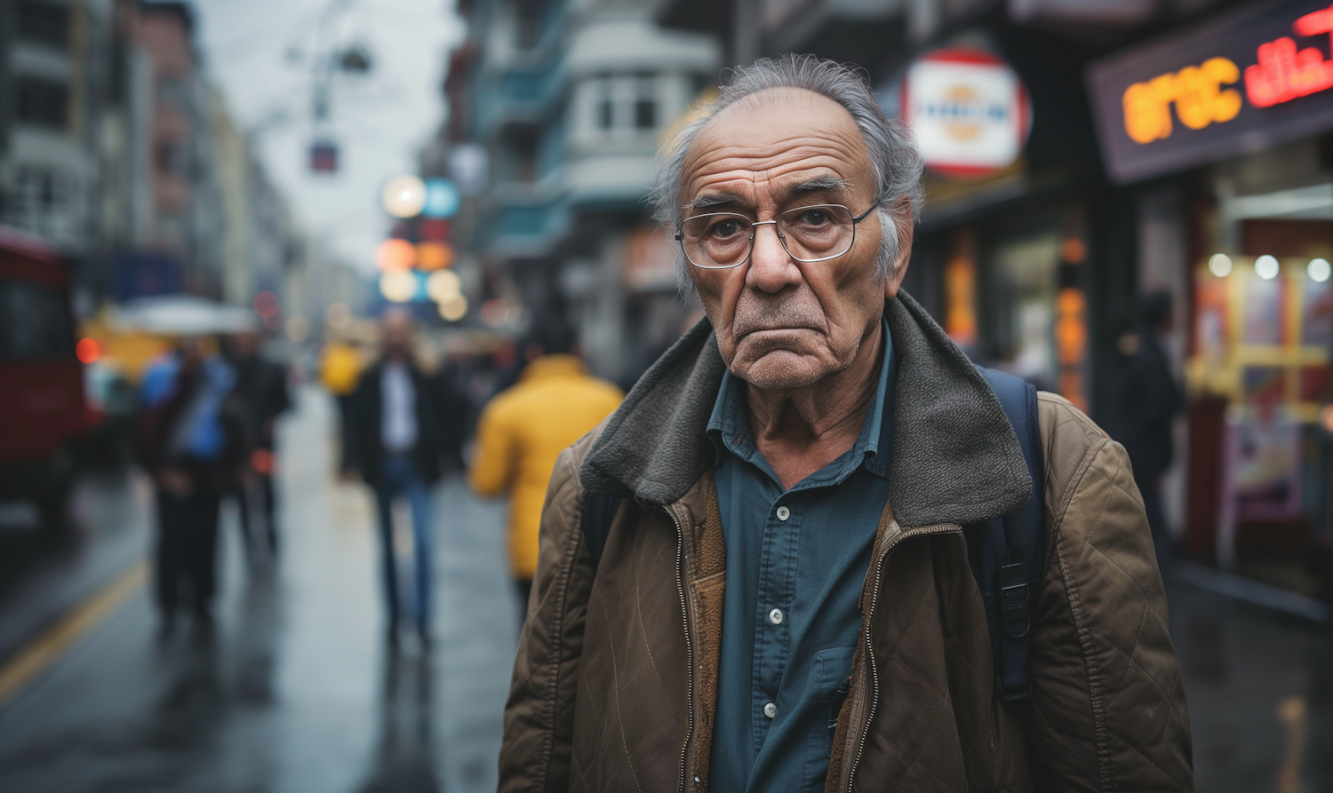 Elderly man with glasses in a brown jacket stands on a busy city street, surrounded by blurred figures and bright lights.