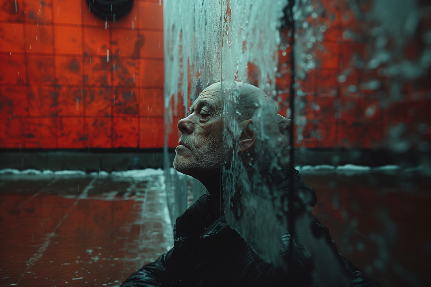 Elderly man in contemplation against a glass wall with reflections, set against a vibrant red background. Introspective and serene mood.