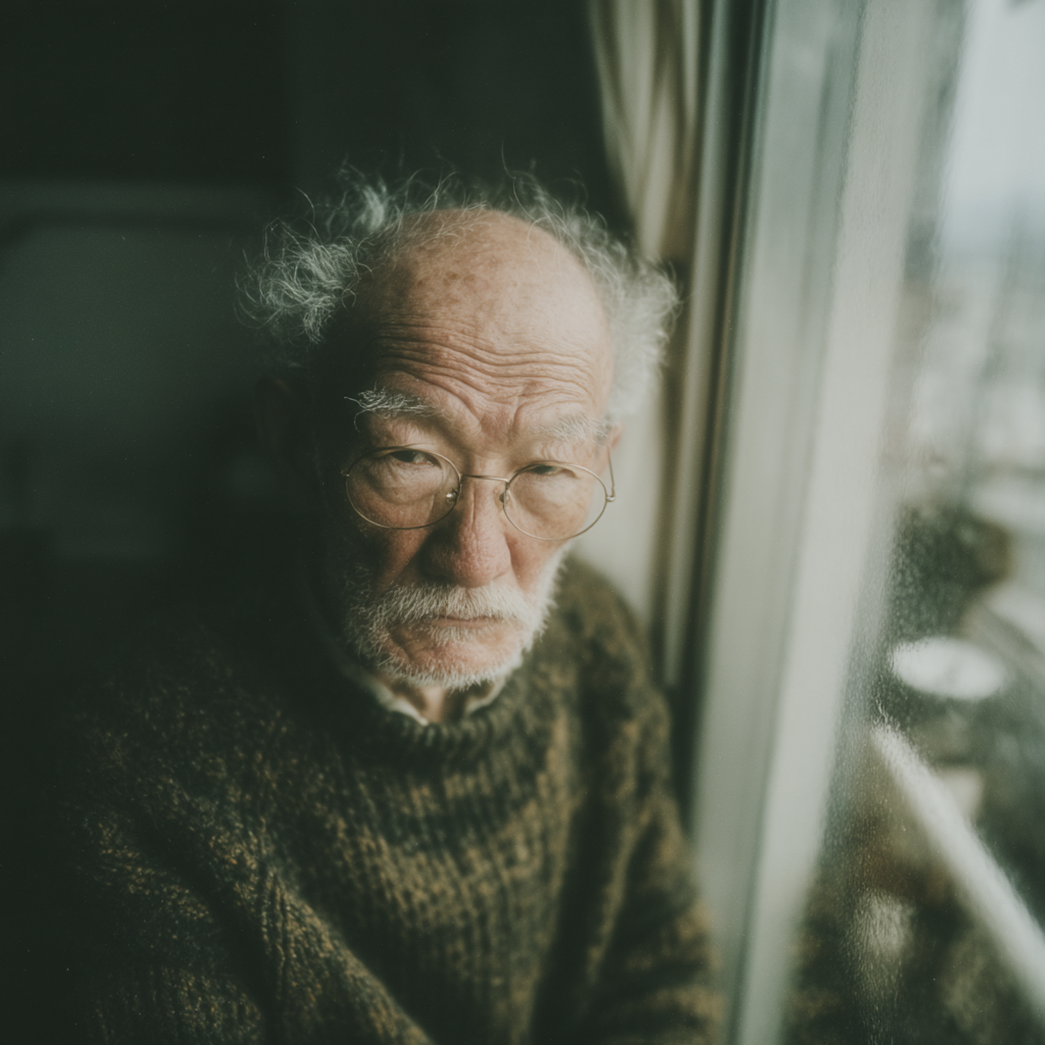 Elderly man with glasses and white hair gazing out a window, wearing a dark sweater, in a softly lit, introspective setting.