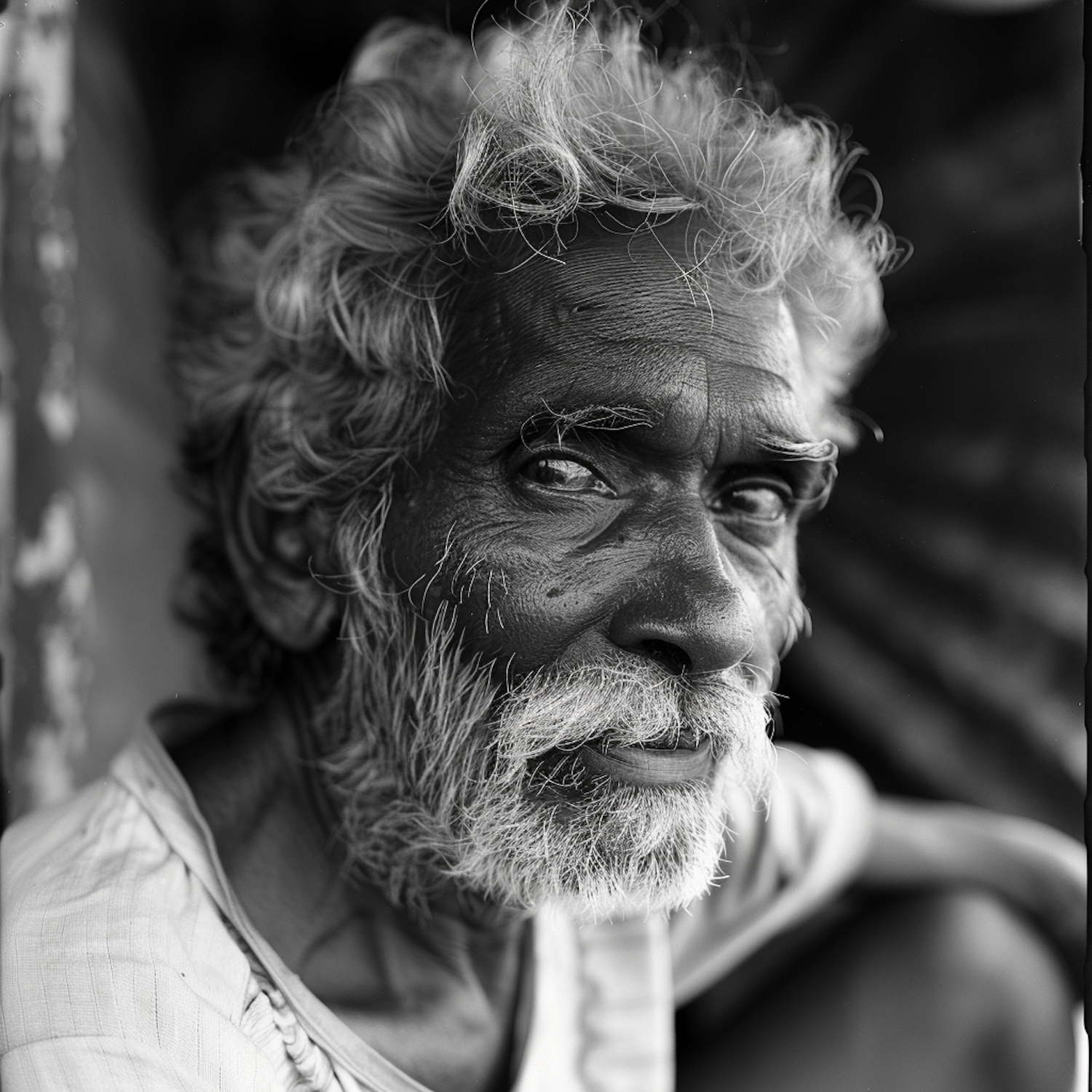 Black and white portrait of an elderly man with a white beard and curly hair, gazing thoughtfully. Captures wisdom and introspection.
