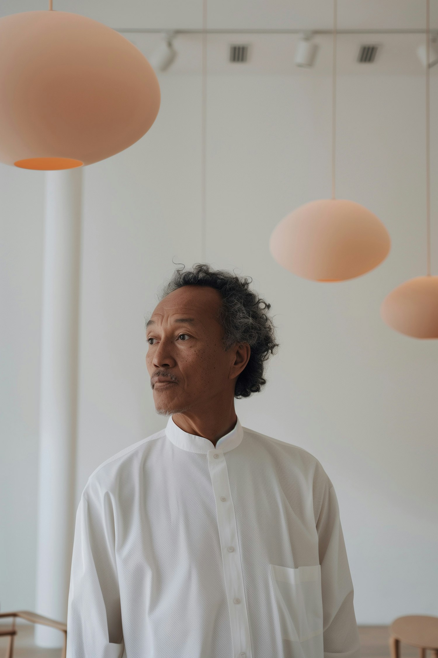 Asian man in white shirt in minimalist room with peach pendant lights, gazing contemplatively to the side.