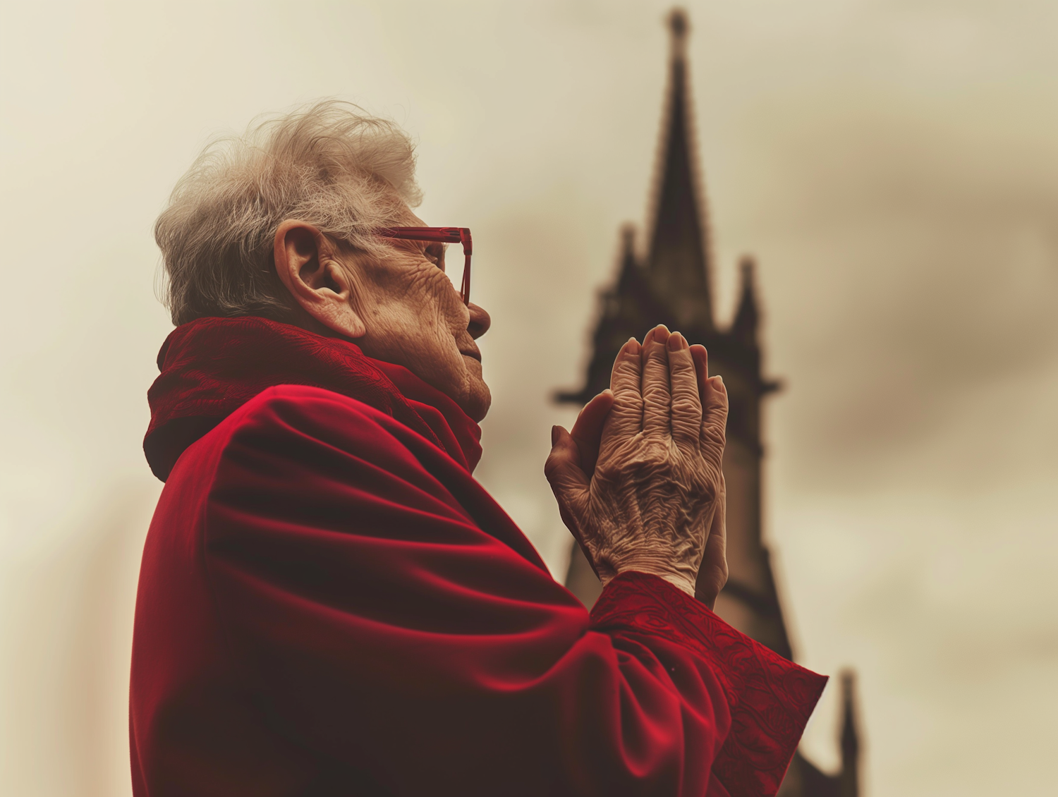 Elderly woman in red coat praying with church steeple in background, creating a serene and contemplative scene.