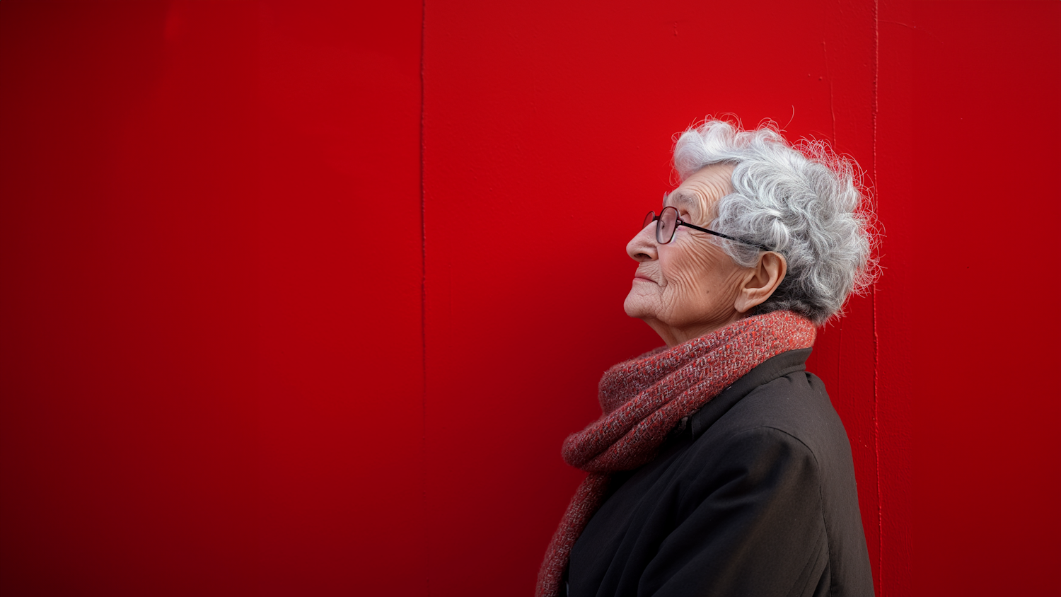 Elderly woman with white hair and glasses in profile, wearing a scarf and coat, against a bold red background.