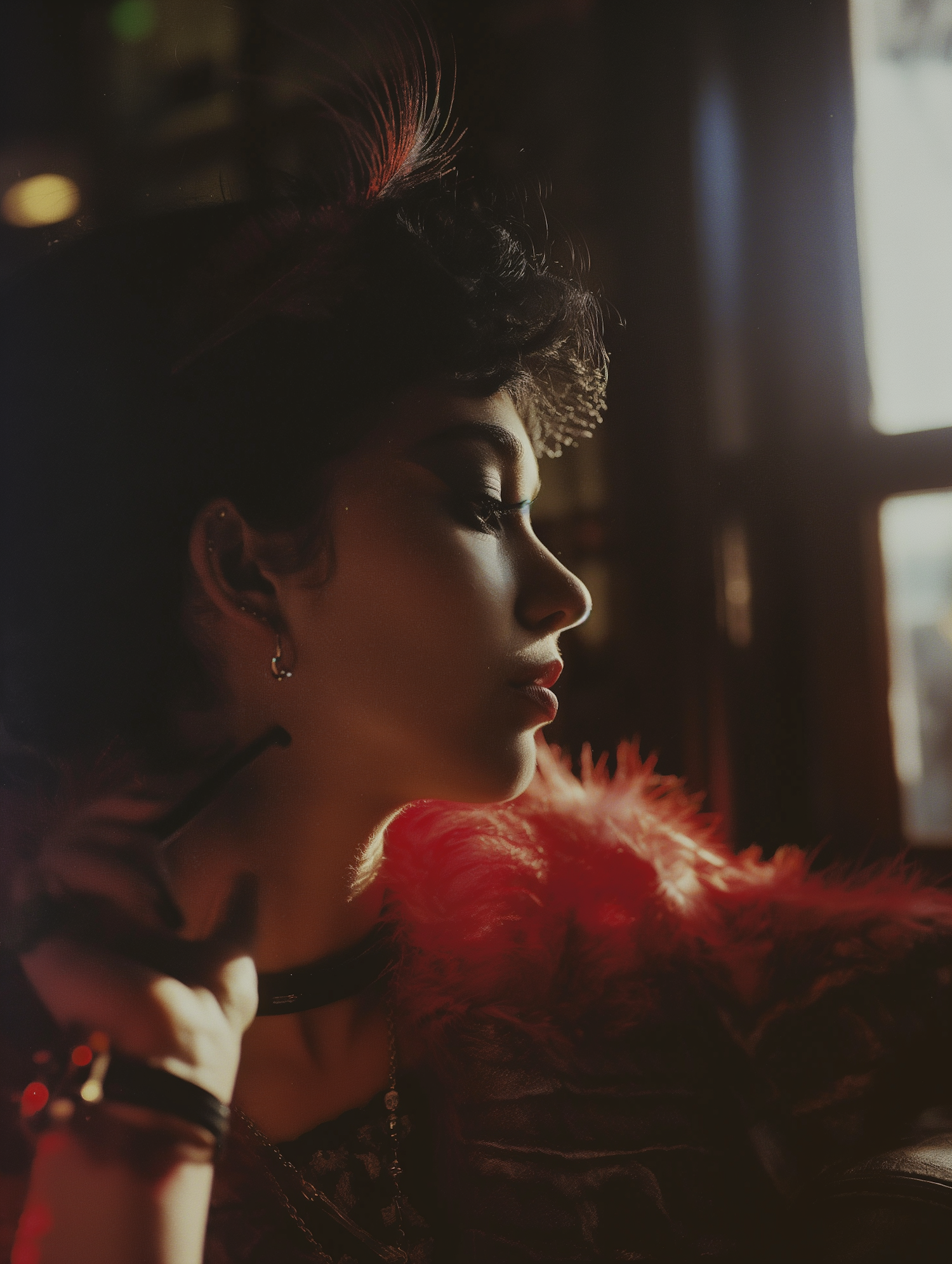 Elegant woman in vintage attire with feathered accessory, holding a cigarette holder in warm, soft lighting.