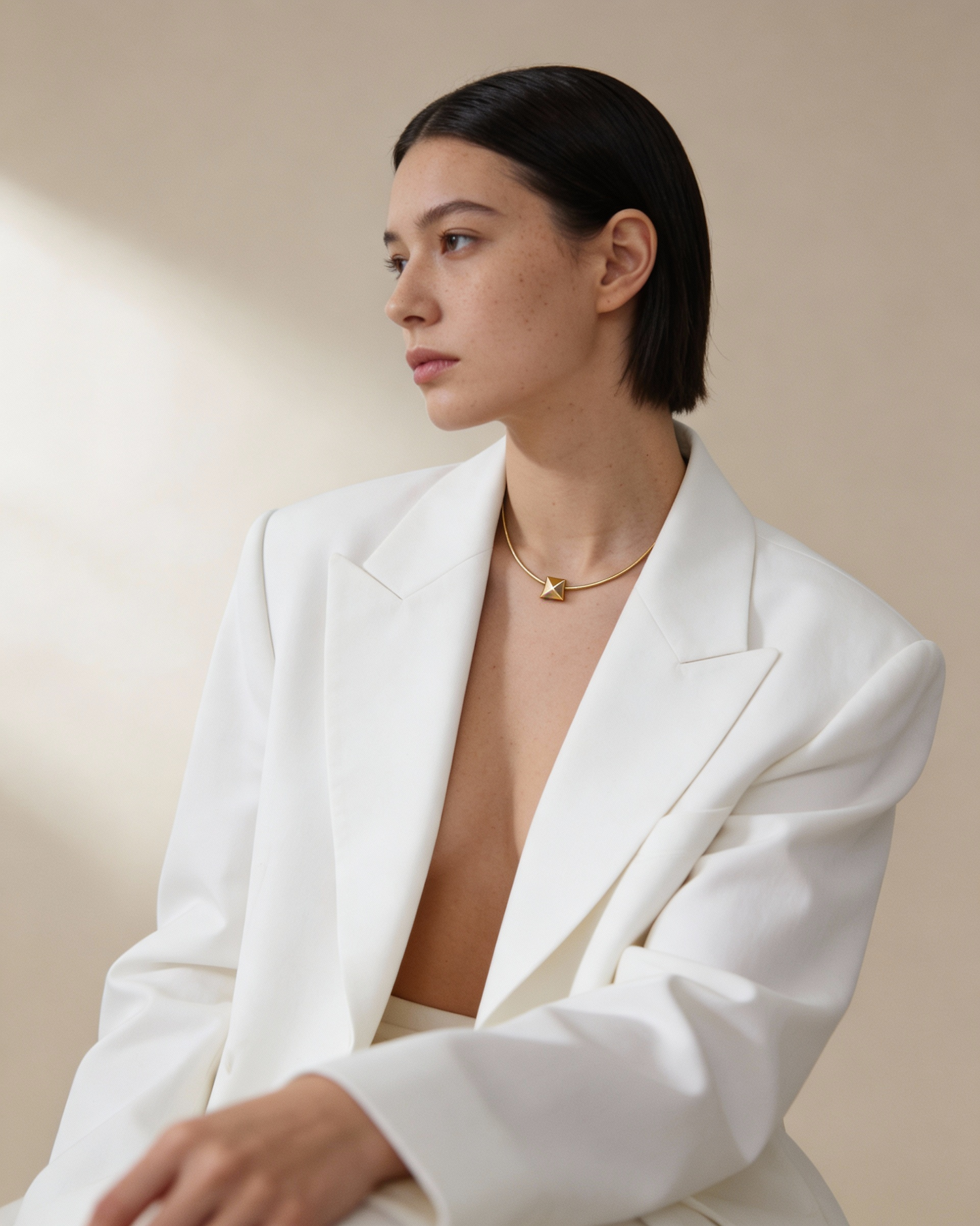 A person in a white blazer and gold necklace sits against a neutral background, exuding a minimalist and elegant style.