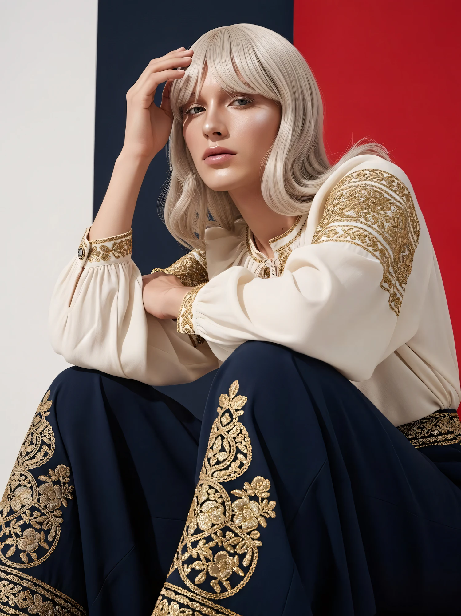 A person in elegant embroidered attire poses against a bold red, white, and blue background, showcasing intricate gold details.