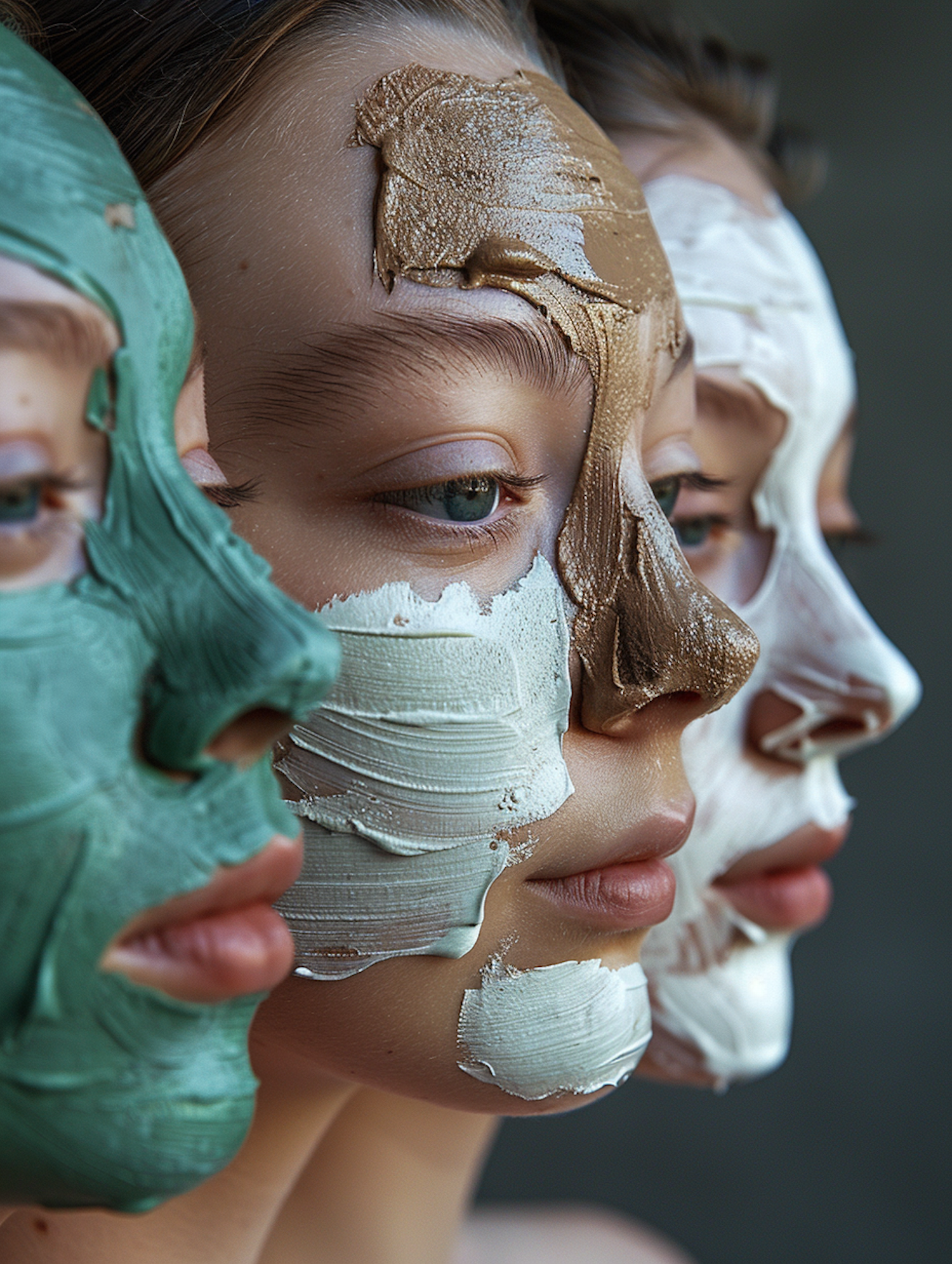 Three women with colorful facial masks applied, showcasing skincare diversity and beauty routines.