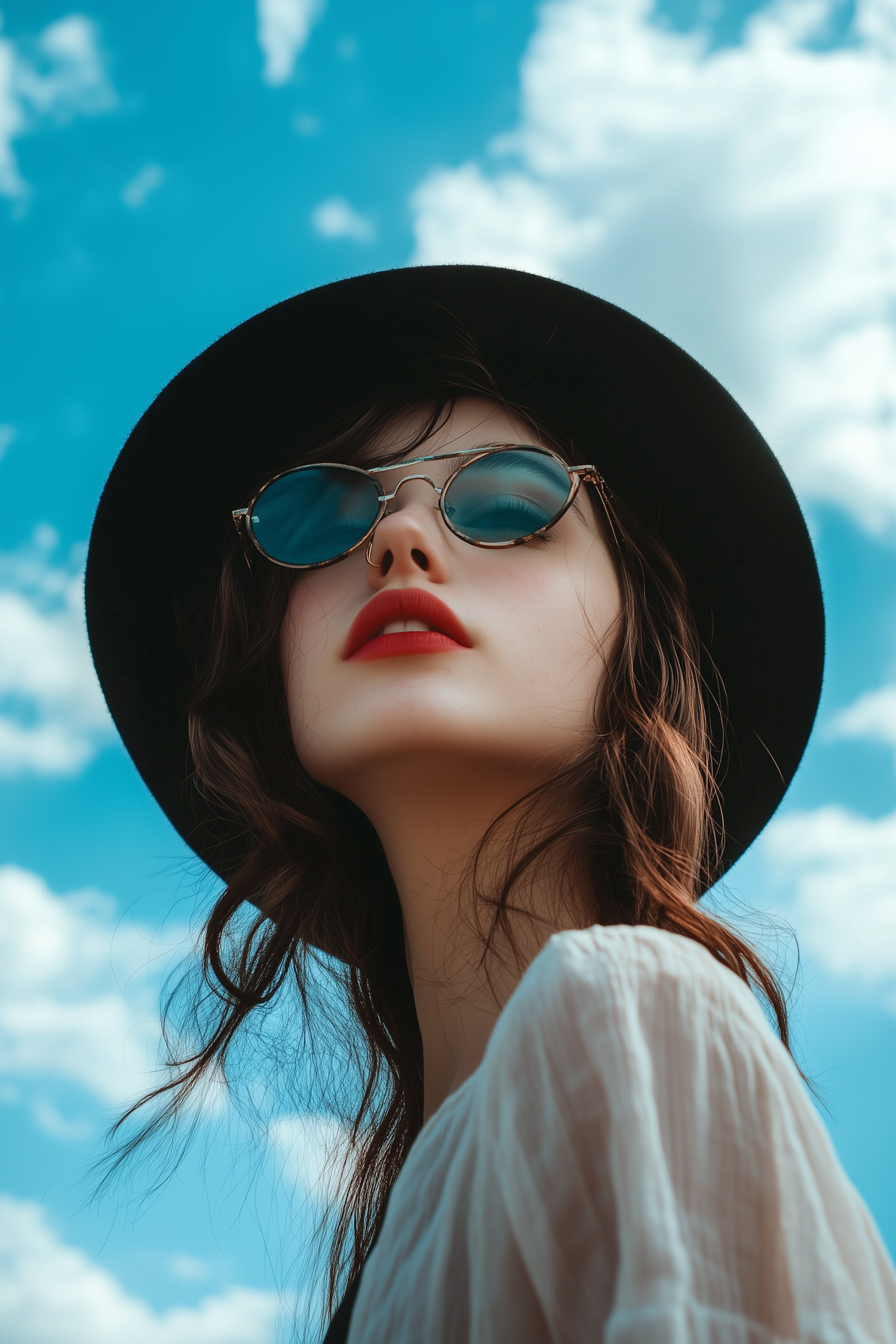 Stylish woman in a black hat and sunglasses gazes at the sky, set against a vibrant blue backdrop with fluffy clouds.