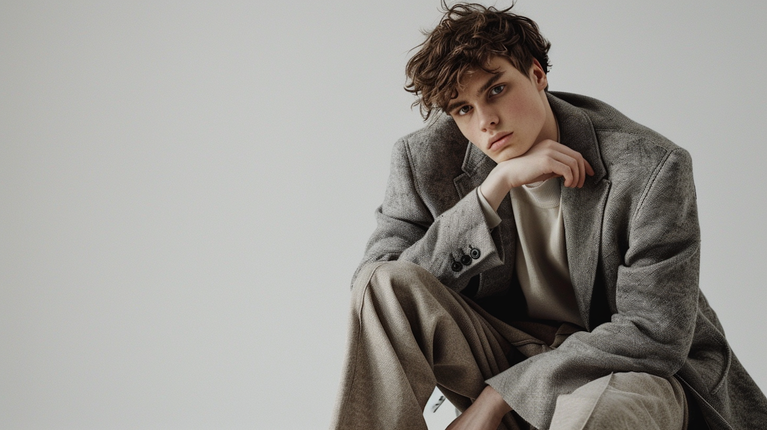 Young man in a gray blazer and beige trousers, sitting thoughtfully against a light gray background.