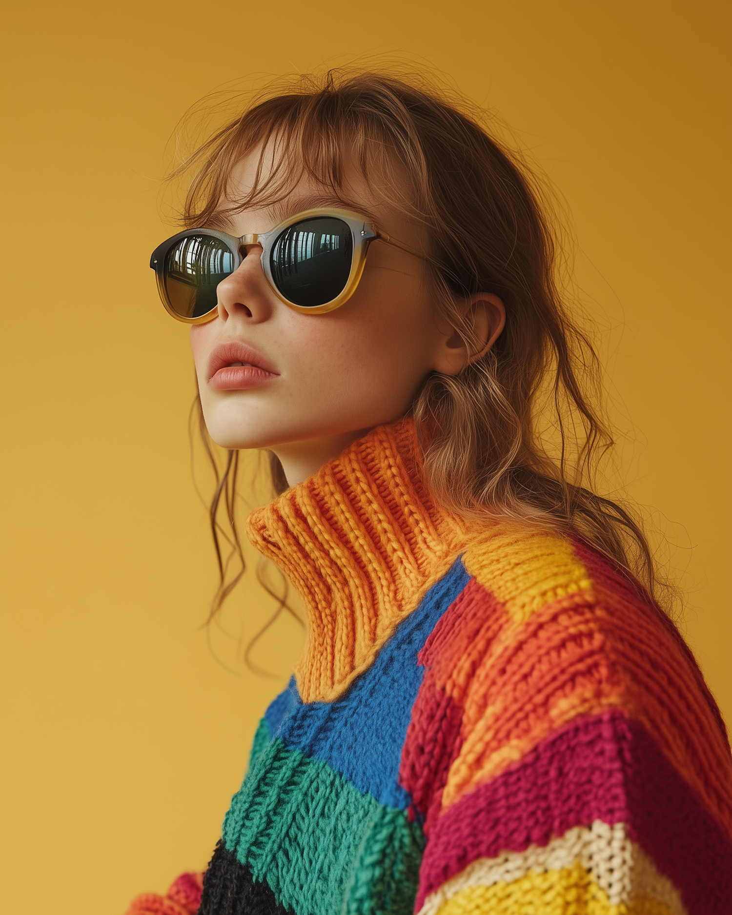 Stylish woman in sunglasses and a colorful sweater against a yellow background, exuding a vibrant and trendy vibe.