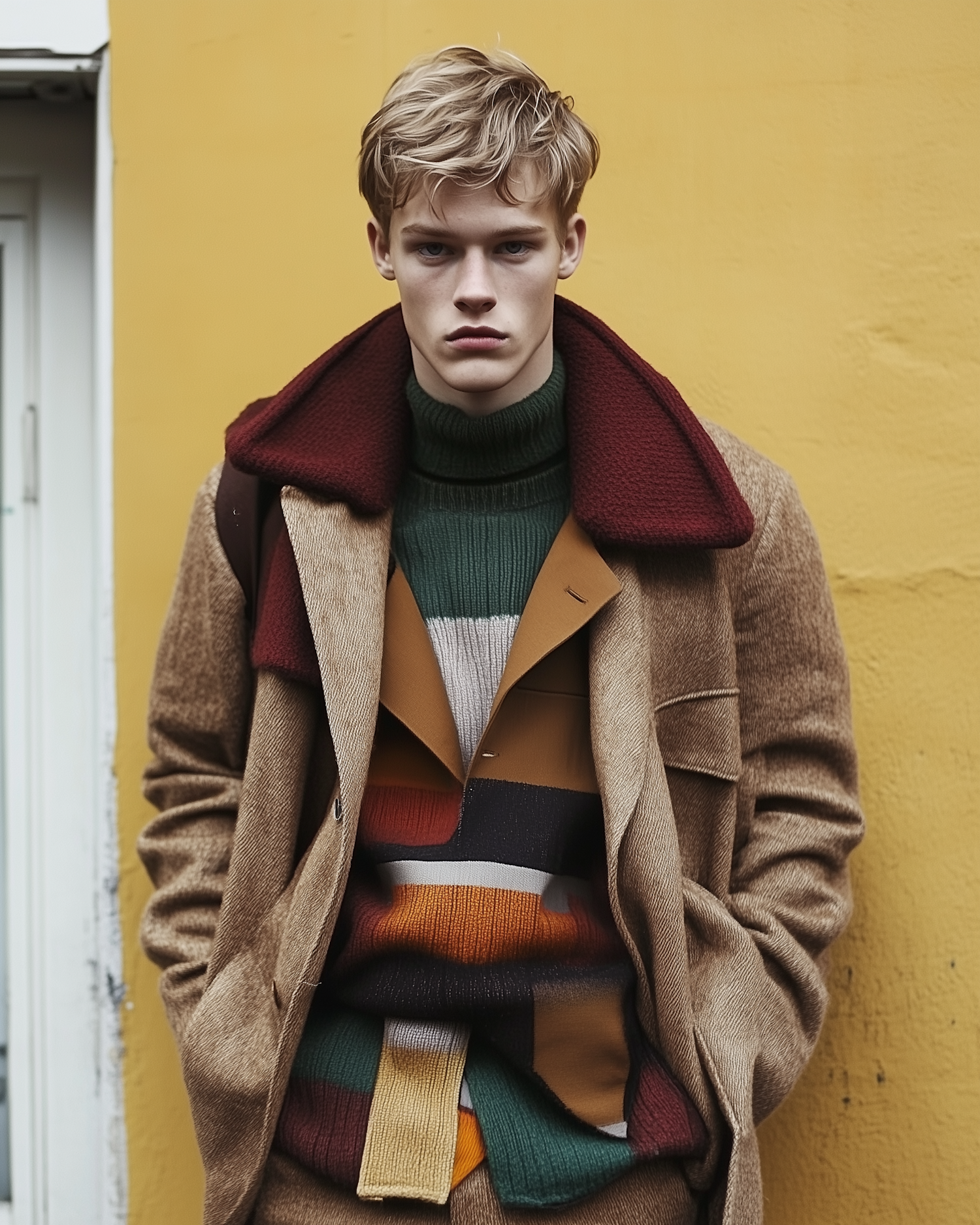 Stylish young man in a woolen coat and colorful sweater against a mustard yellow wall, exuding modern fashion vibes.